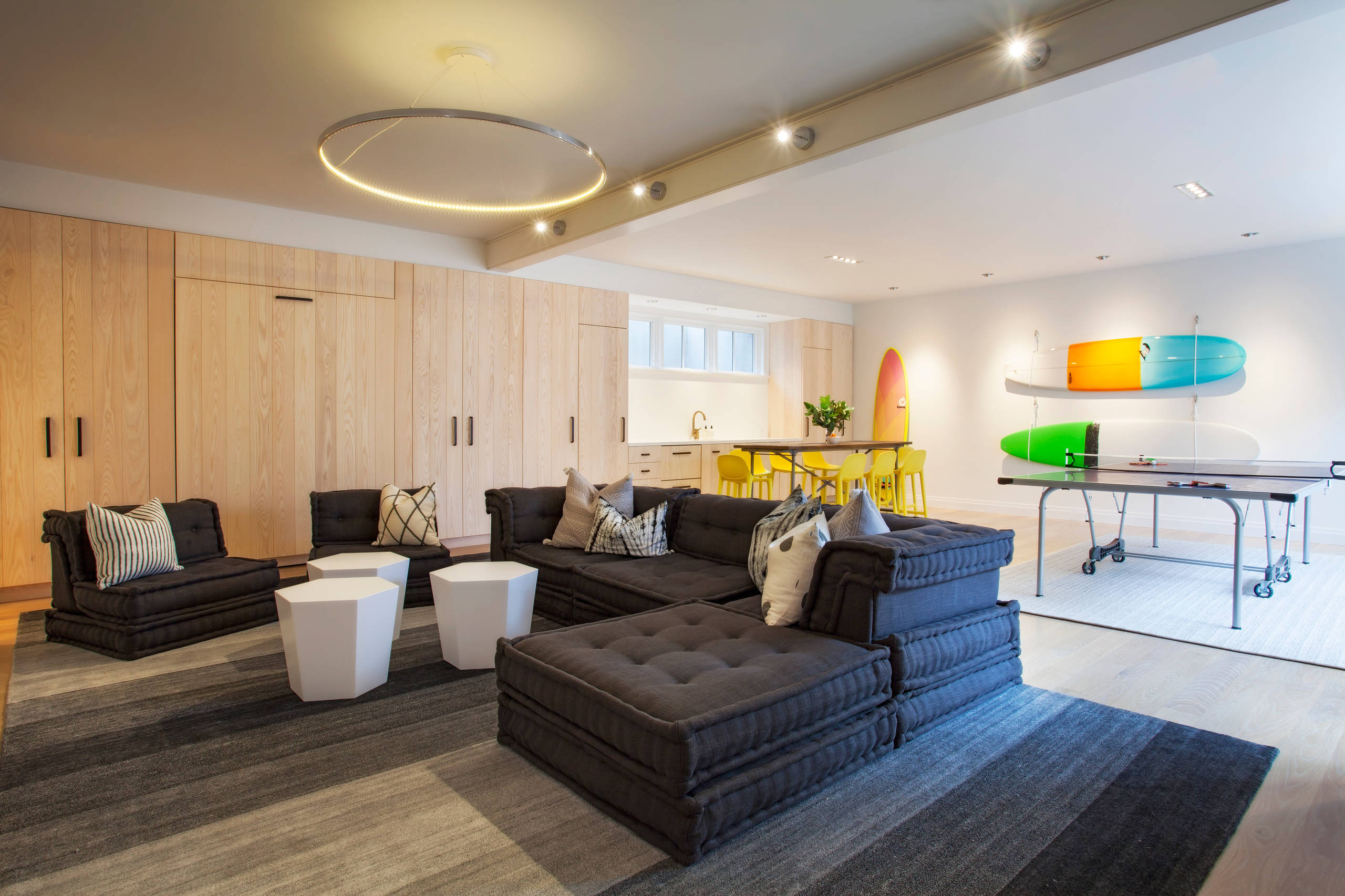 4. Beachy vibe. Bright surfboards gracing the walls of this modern Boston basement create a fun summer feeling. Table tennis, anyone?