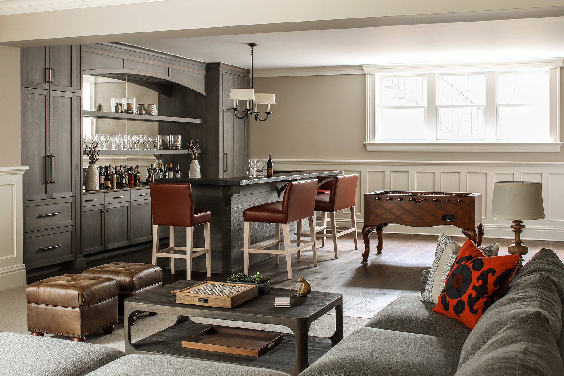 2. Old-world elegance. The wall paneling and built-in bar of this basement elevate the room. Leather ottomans, brown bar stools and fancy foosball table add rich warmth to the greige and gray palette.