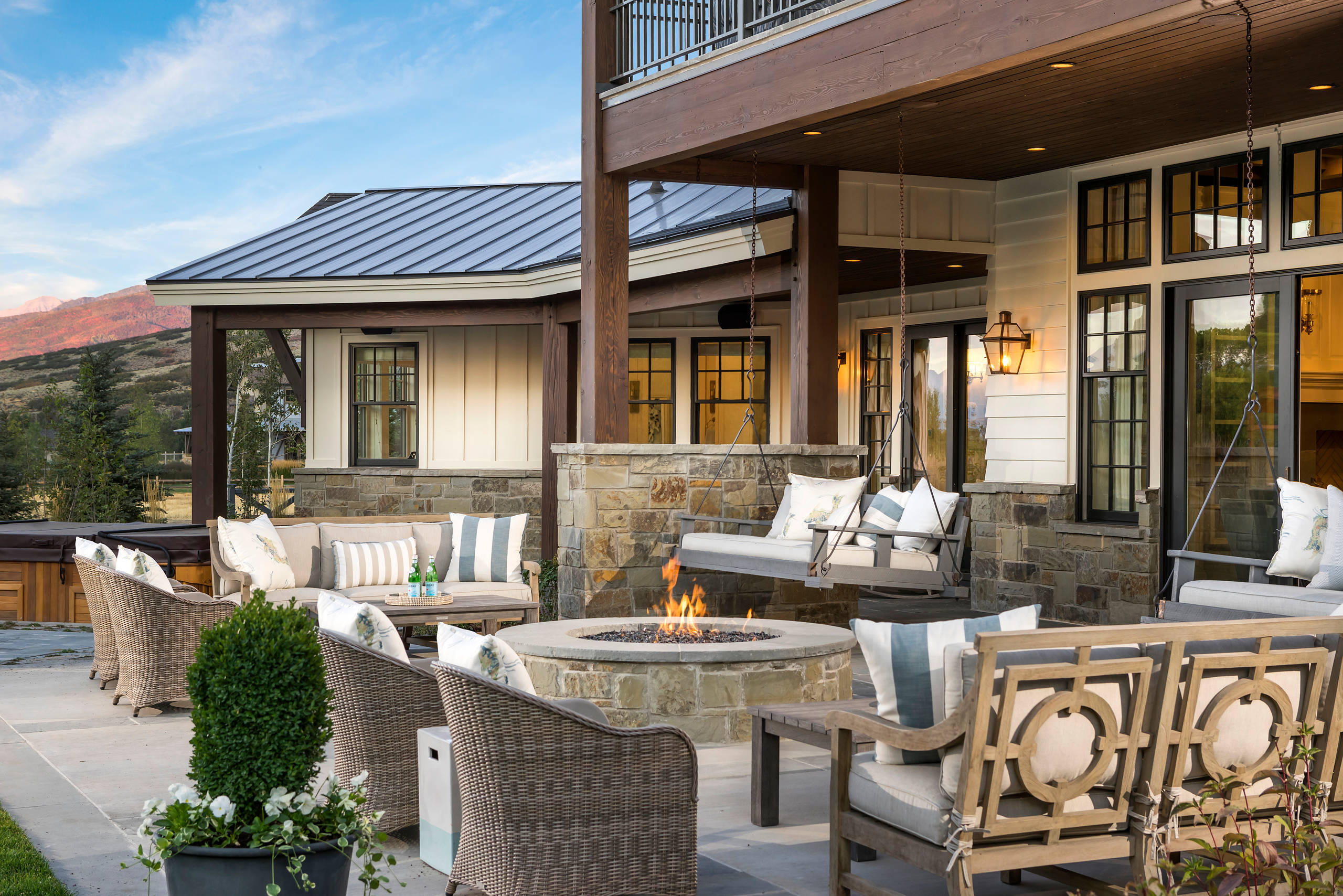 This fire pit has a variety of seating options around it, including cushy armchairs, a love seat, a sofa and a pair of porch swings. The proximity to the house makes it an inviting spot for an after-dinner hang.