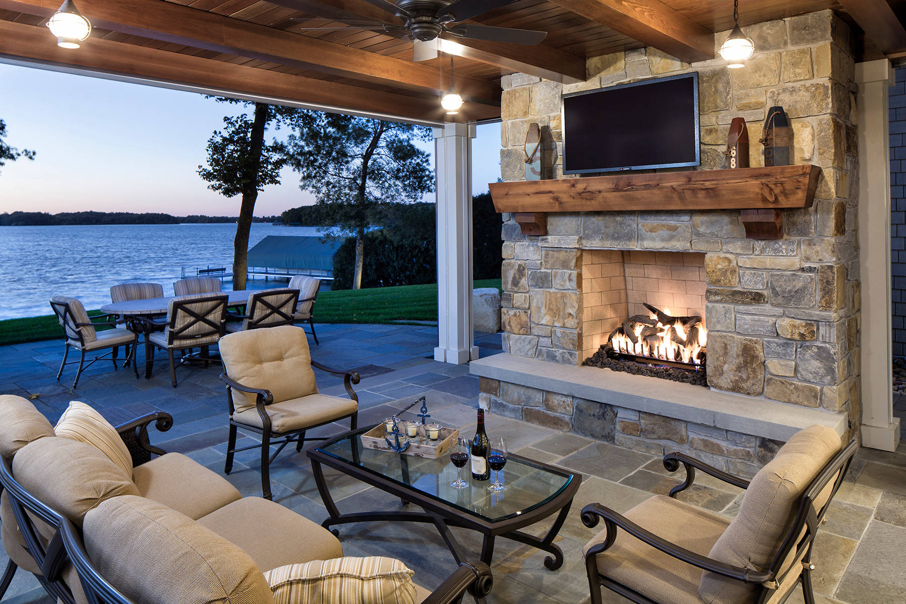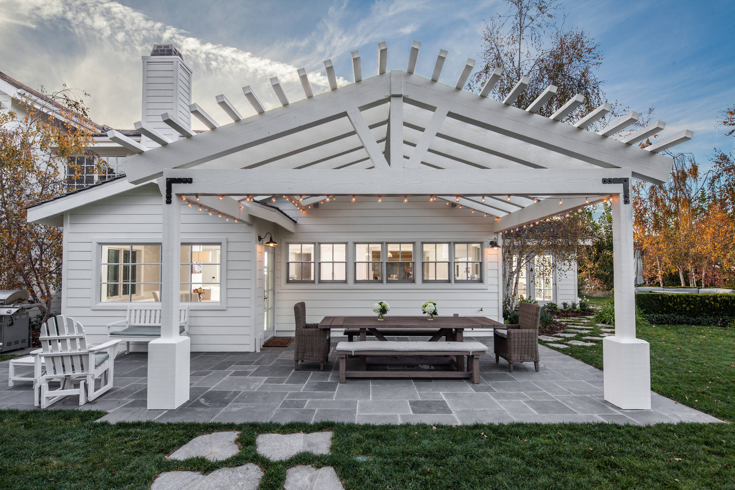 This open structure makes the stone patio feel more defined as an outdoor room. The glow from the lights hung overhead make it a wonderful place for an evening dinner.