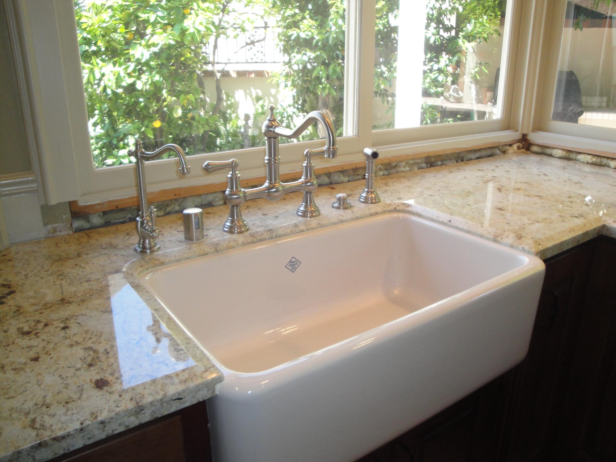 Now let’s look at a few layouts in terms of the number of holes drilled. The easiest layout to drill is a single faucet centered on the sink, as shown in this photo.
