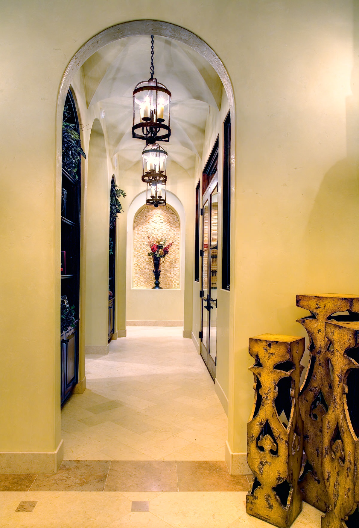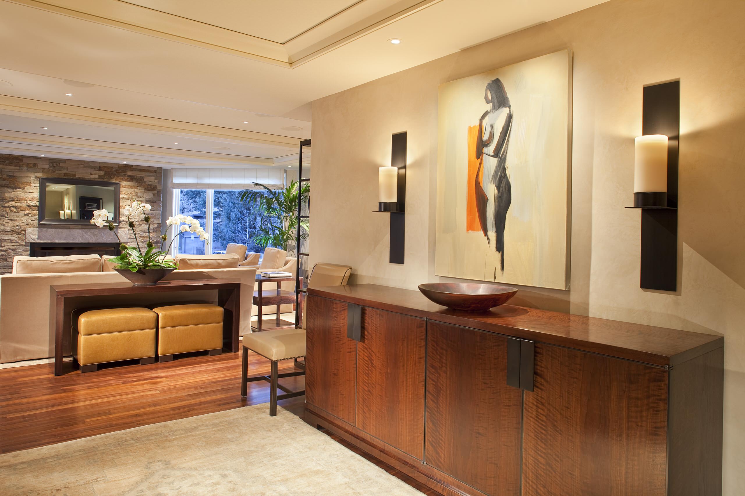 Many entrances have some natural light, so the goal for this space is to ensure adequate lighting for the evening and those times when the clouds roll in. In this entrance wall sconces add ambience and free up space on the console table, while a ceiling fixture provides a good amount of general lighting. Good color contrast in the furniture, flooring and light fixtures aids in depth perception and creates a warm welcome.