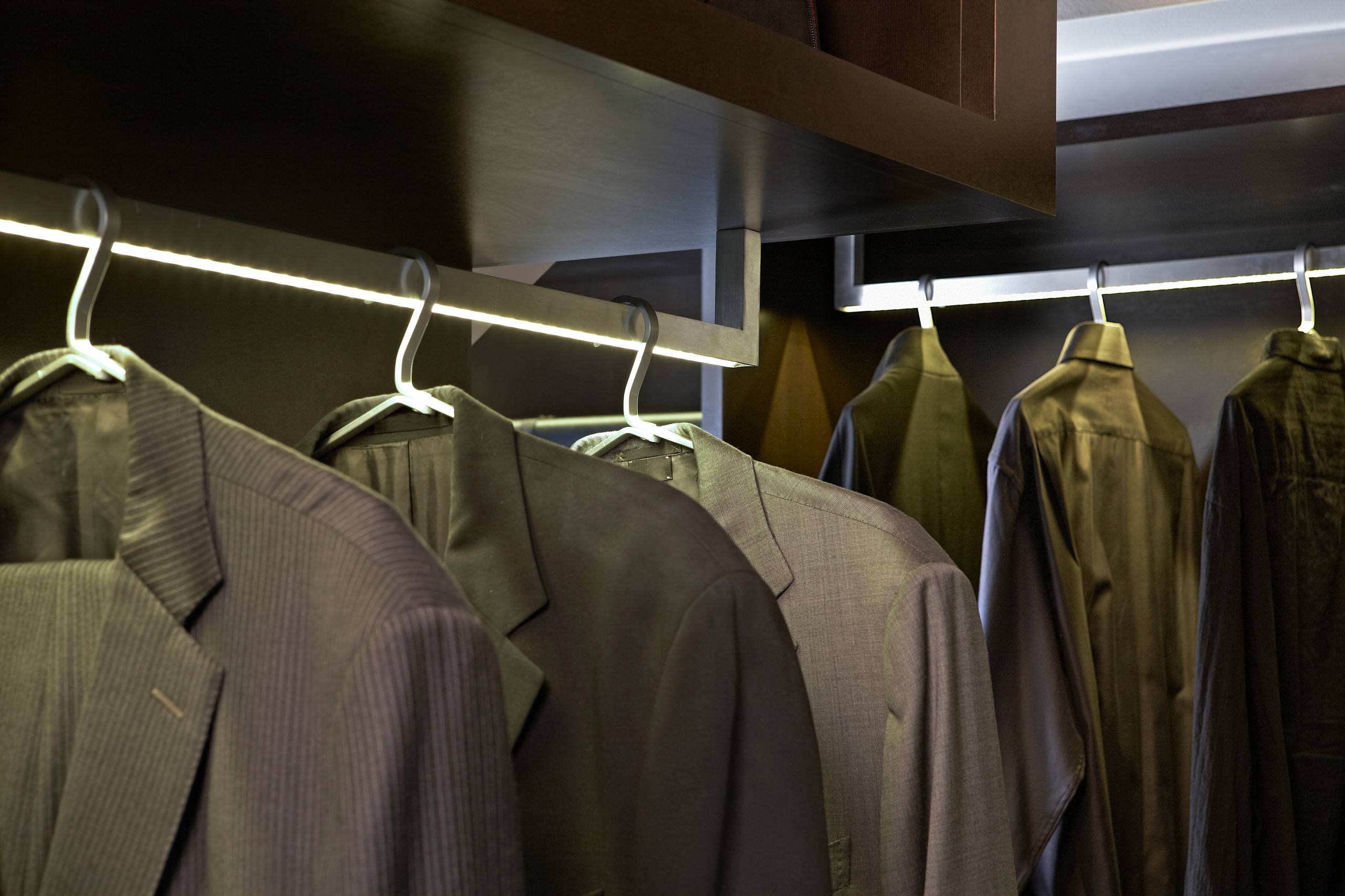 Lighting is included throughout the cabinetry interior of this closet. It creates not only a more uniform lighting scheme, but a bit of a contrast between items on the shelf for easier distinction.