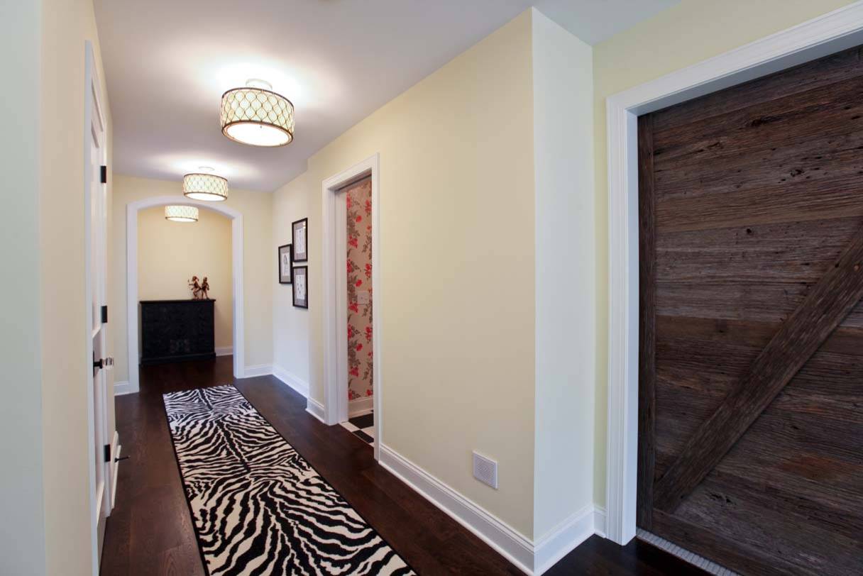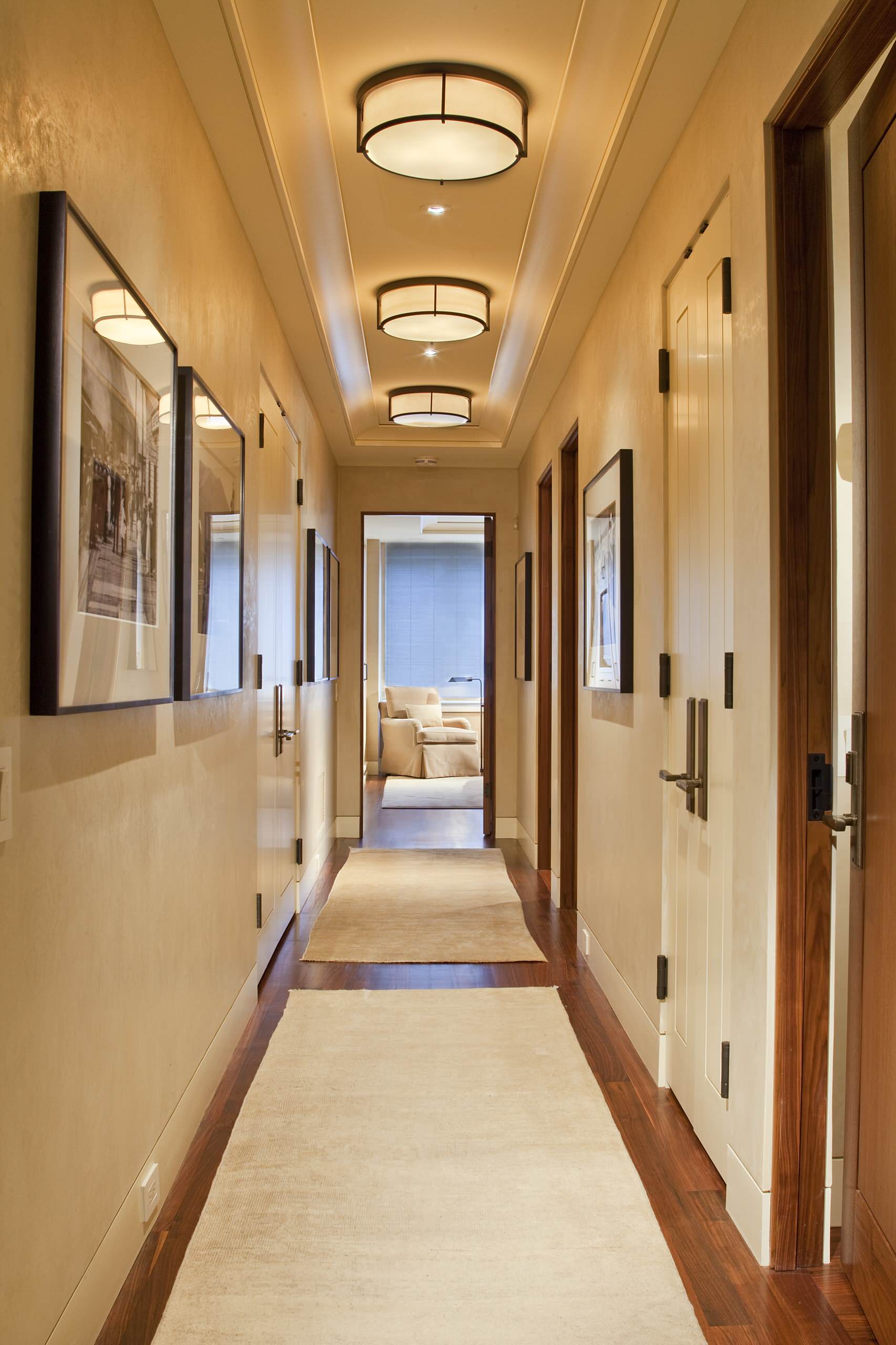 This hallway combines both recessed and surface-mounted fixtures. This combination creates additional flexibility for night lighting — particularly important for young and old when visiting the bathroom. The ceiling-mounted fixtures or the pot lights could also be triggered by a motion sensor for safe navigation during the night without anyone's having to remember where the light switch is.
