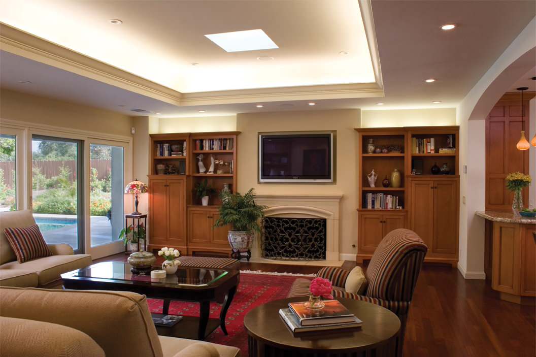 This living room has the full gamut of lighting. The recessed cove lighting brightens the ceiling and reflects light down, a skylight brings in natural light during the day, lighting above the cabinets brightens up an otherwise dark recess, downlighting in the pot lights defines the perimeter of the room and accents the fireplace, and lamps provide general ambience lighting.