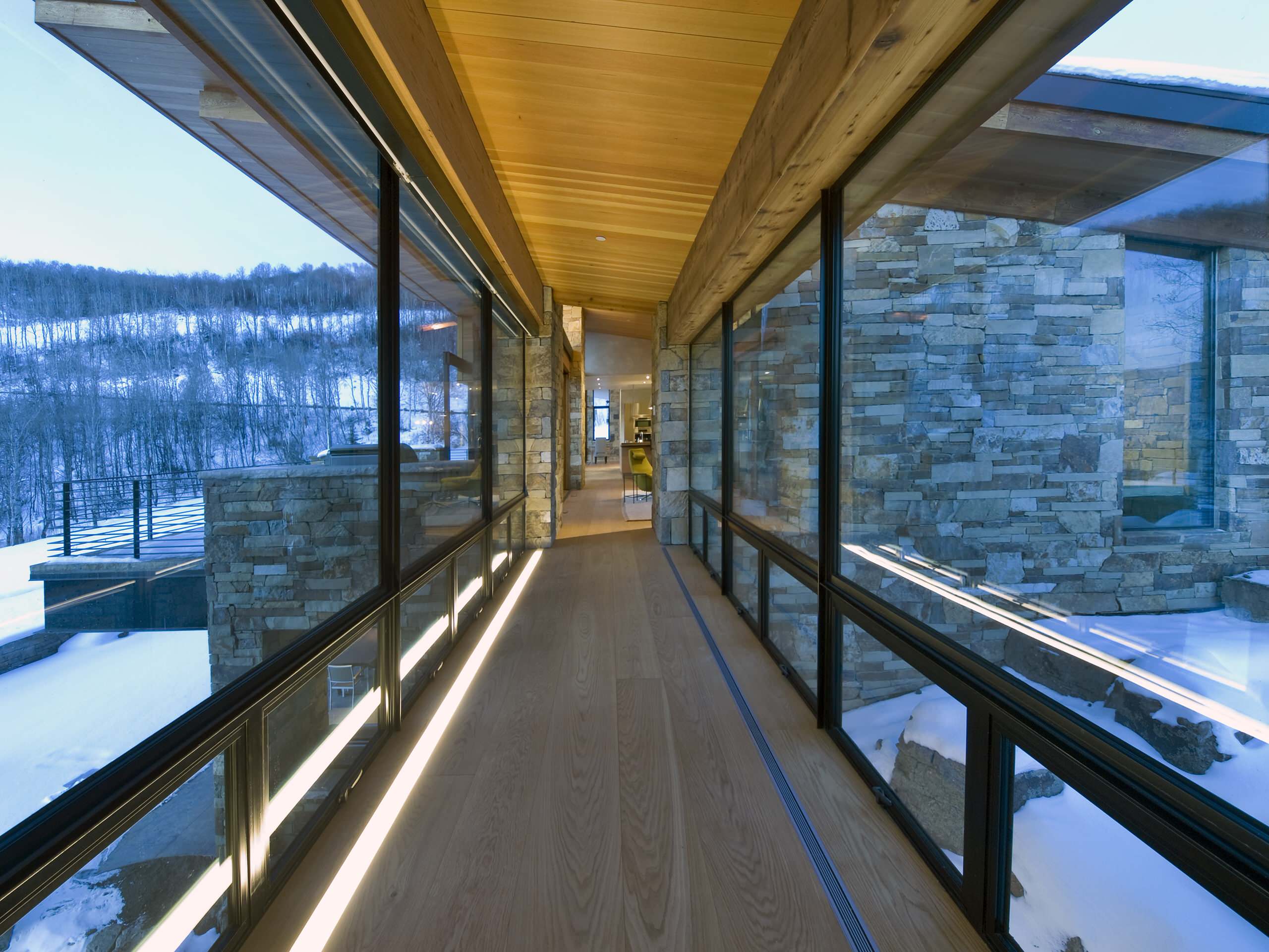 This bridge incorporates linear floor lighting. This is a good example of pathway lighting and visual cueing. This idea can be transferred to a regular hallway using the same lighting type, or you can also use recessed floor lights to create a similar effect. Lights placed closer to the wall and with an etched diffuser should reduce or eliminate any glare.
