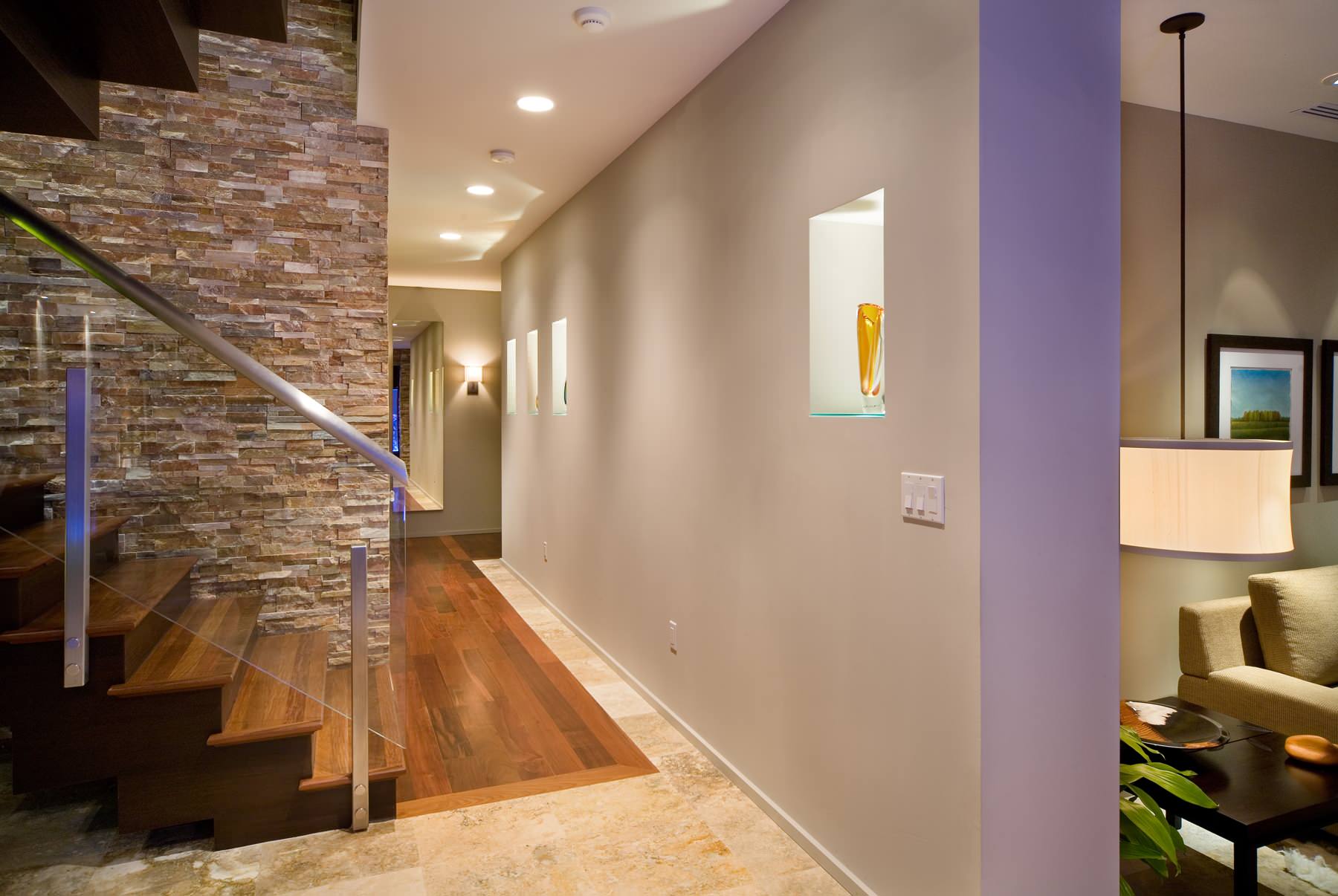 This hallway niche offers a stylish way to add lighting and visual cues. Lighted niches keep the hallway clear of obstruction because the light is in the wall instead of protruding. It also gives the hallway a bit of flair at a time when universal design can be thought of as sterile and institutional.