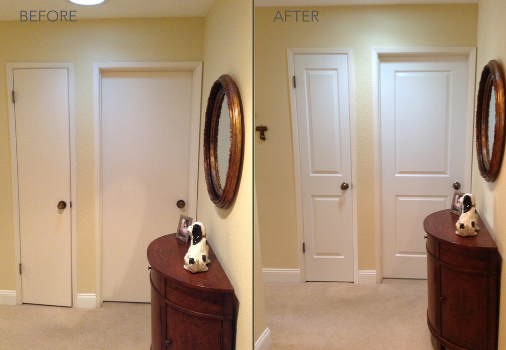 Here is an inexpensive example of two flush doors’ being replaced by two-panel doors.