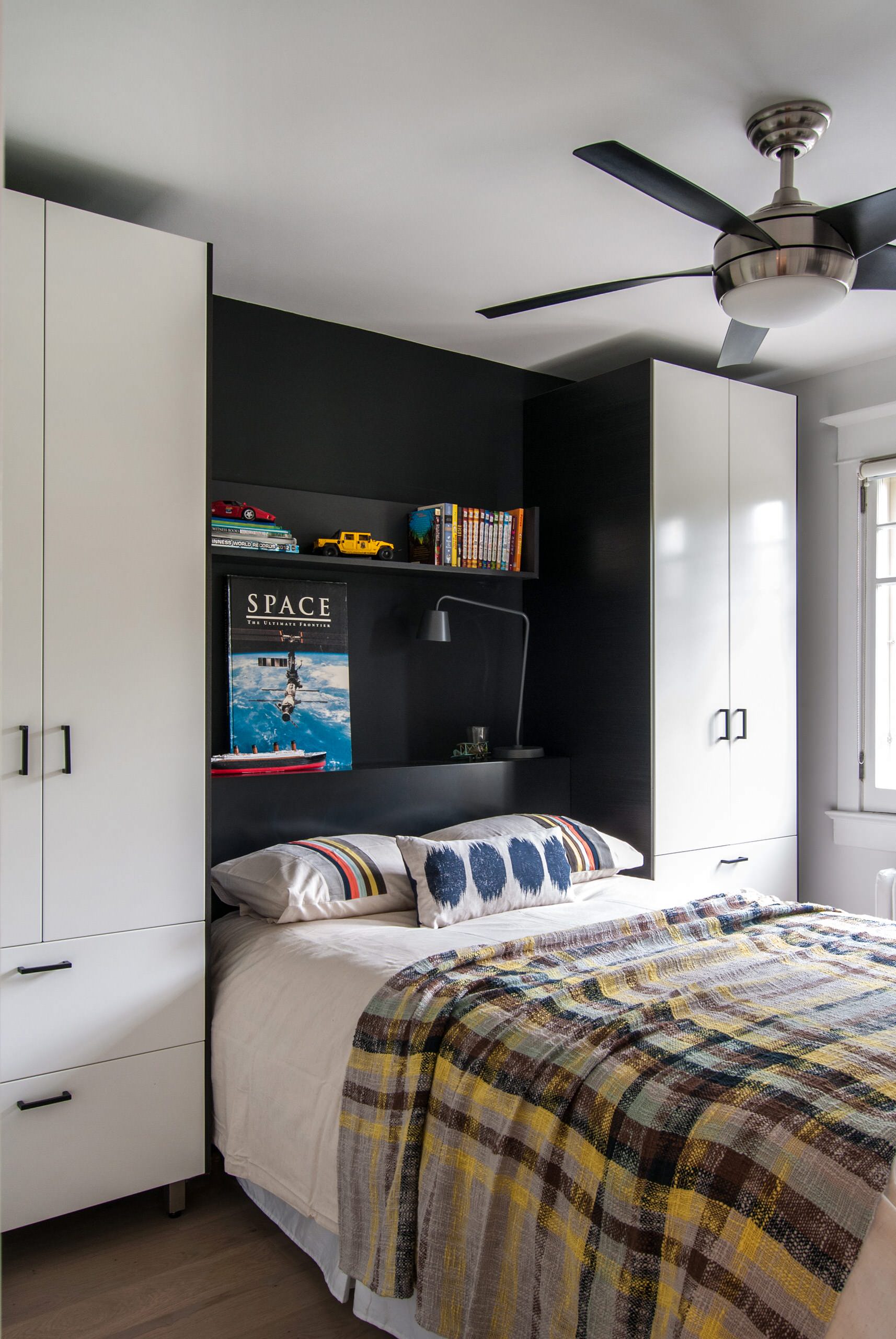 Create a headboard. Wall-to-wall black is too dark to live with, but a feature wall of black looks strong without overpowering a scheme. Here the black on the wall has been continued onto the sides of the built-in wardrobes to create a wraparound-headboard effect.