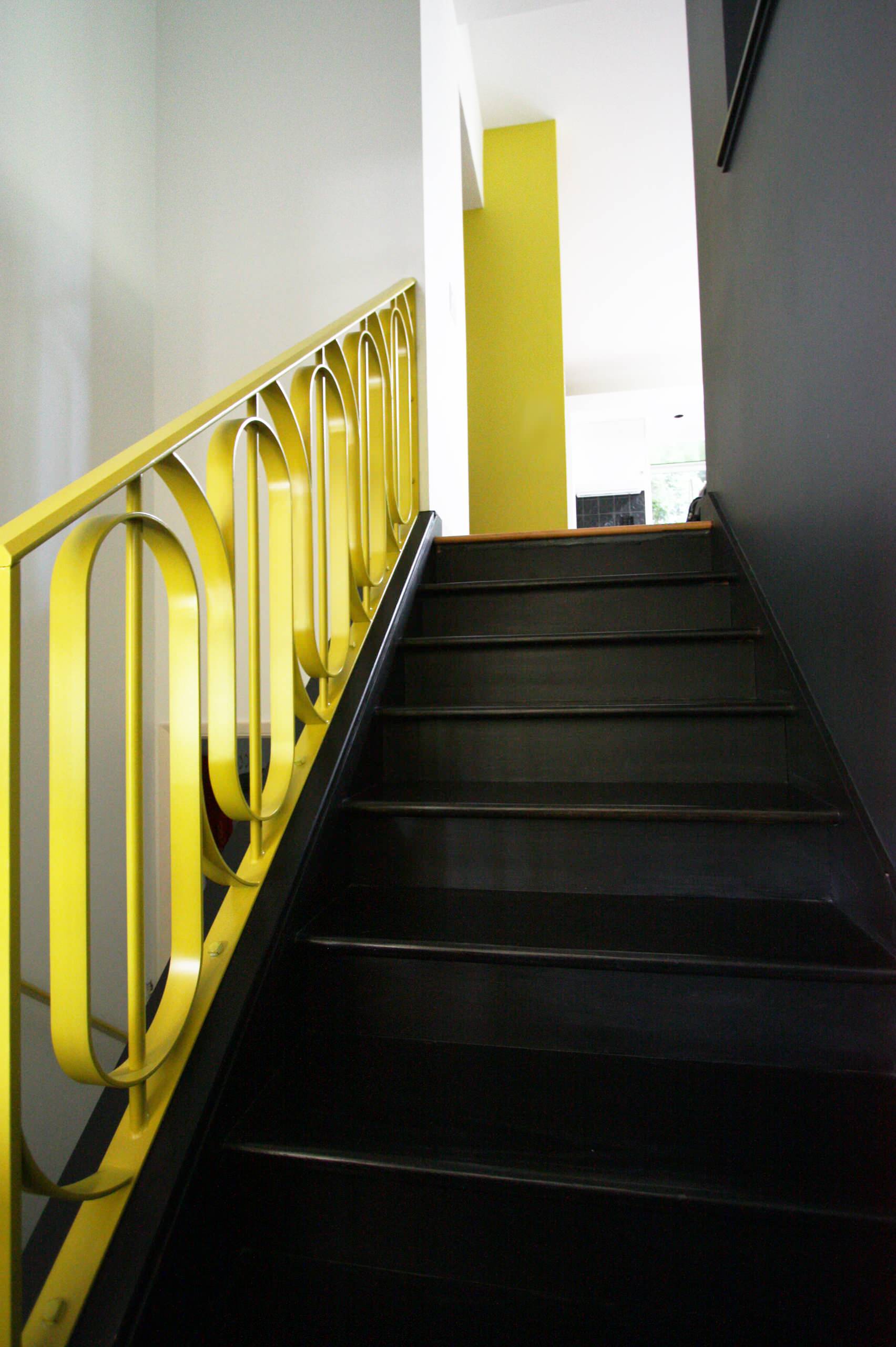 Take it upstairs. Wooden stairs, simply painted, look great in any home, but why not take the black theme upstairs, too? Dark stairway walls create a slash of drama at the heart of the house and, with colored banisters, the look is positively rock ’n’ roll!