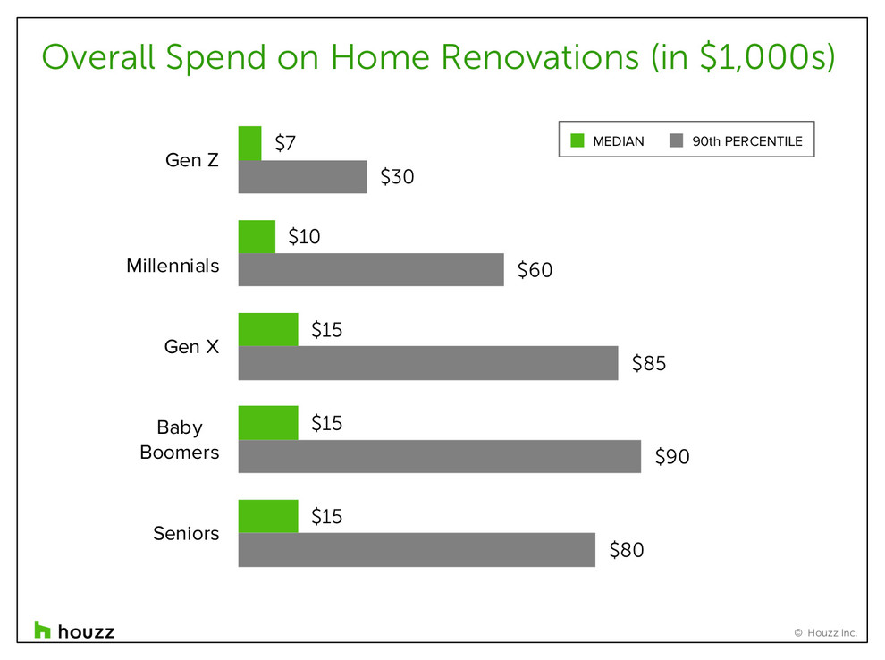 The green bars in this chart show the median home renovation spending amount in 2018 for each generation of homeowners who renovated. “Median” refers to the midpoint spending amount on home renovation projects in 2018, with half of homeowners spending more than this amount and half spending less. Economists prefer the median to the average, or mean, because that number can be skewed upward in a misleading manner by one-off projects that cost a lot more than others. For millennial homeowners who renovated in 2018, the median spending amount in the U.S. was $10,000. For Gen Xers, baby boomers and seniors it was $15,000.