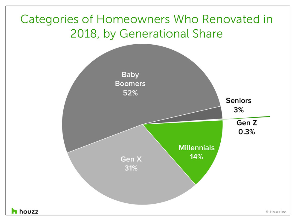 The Houzz & Home survey sheds light on the demographics of home renovation in the U.S., and this pie chart sums up the breakdown by generation. More than half of homeowners who renovated last year were baby boomers (ages 55 to 74), 31 percent were Gen Xers (ages 40 to 54) and 14 percent were millennials (ages 25 to 39).