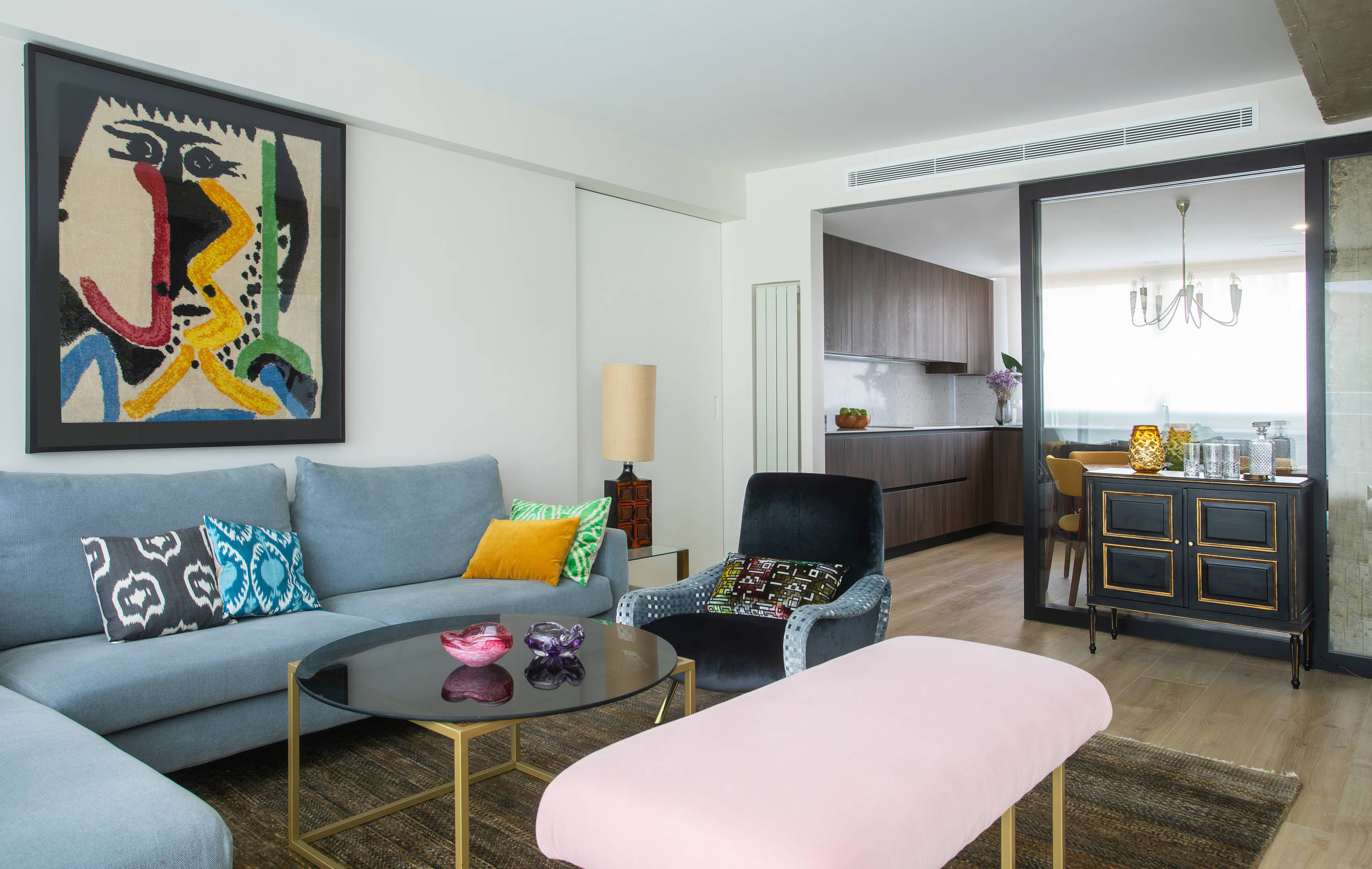 The home of blogger María Vázquez from Dr. Living Home is an ode to millennial style. Pictured is her living room with an adapted sofa from Maisons du Monde. Vázquez changed the legs and added a wooden board. She made the coffee table, which includes cut copper pipes.