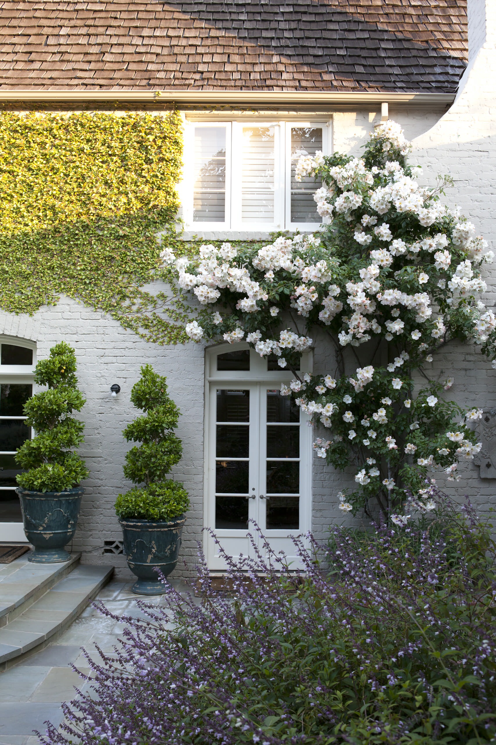 Unlike vines, climbing roses don’t have tendrils to help them grab onto structures for support, so tying the canes to supports with flexible plant ties or strips of pantyhose is necessary.