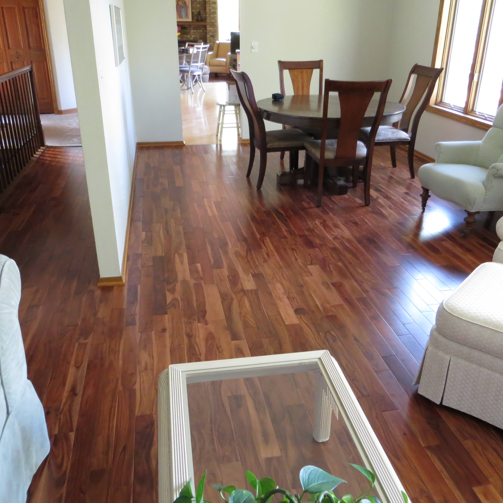 Acacia, shown here, is an exotic wood from Asia that Zheng says is a hot seller right now, because of its mix of lighter and darker tones; plus, it’s harder than hickory. The cost ranges from about $4 to $6 per square foot at his warehouse. The unique look is worth the higher cost for some.