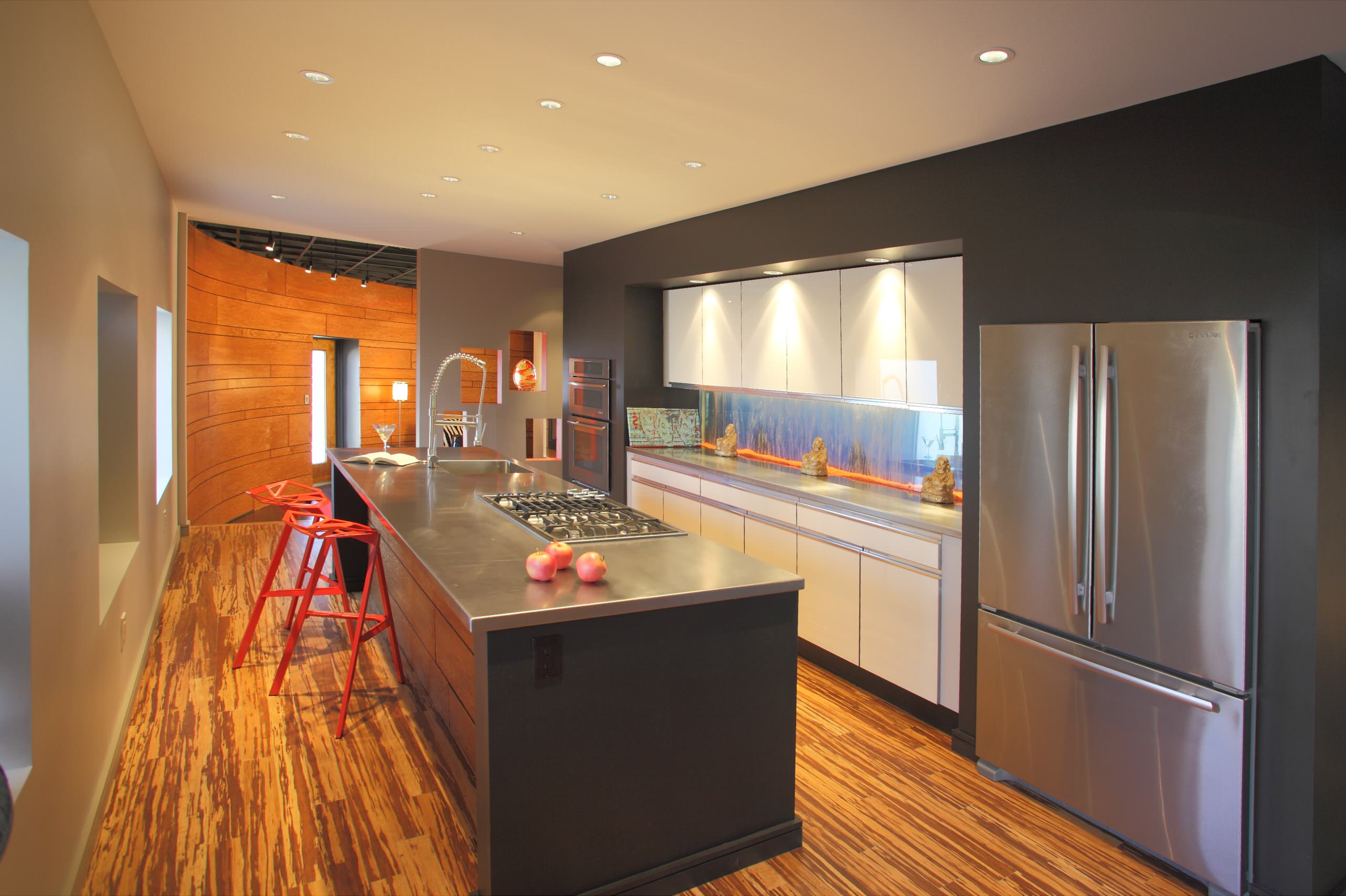 Stained strands in the bamboo flooring add a dramatic element to this contemporary kitchen.