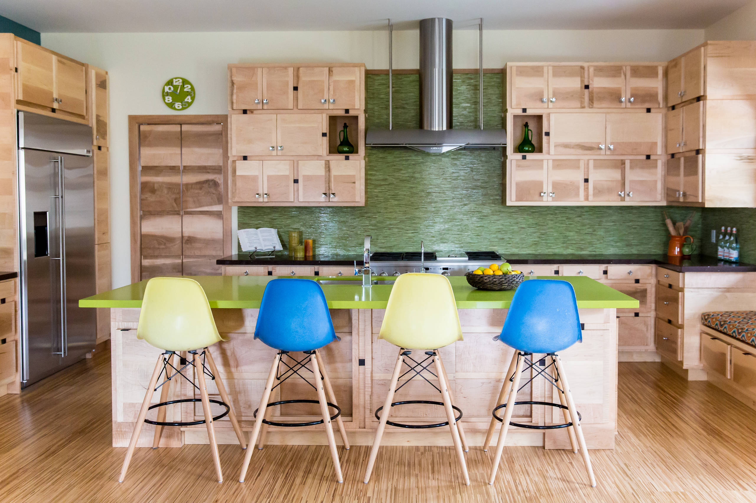 The striking stripe effect of this bamboo floor enhances the kitchen’s eclectic aesthetic.