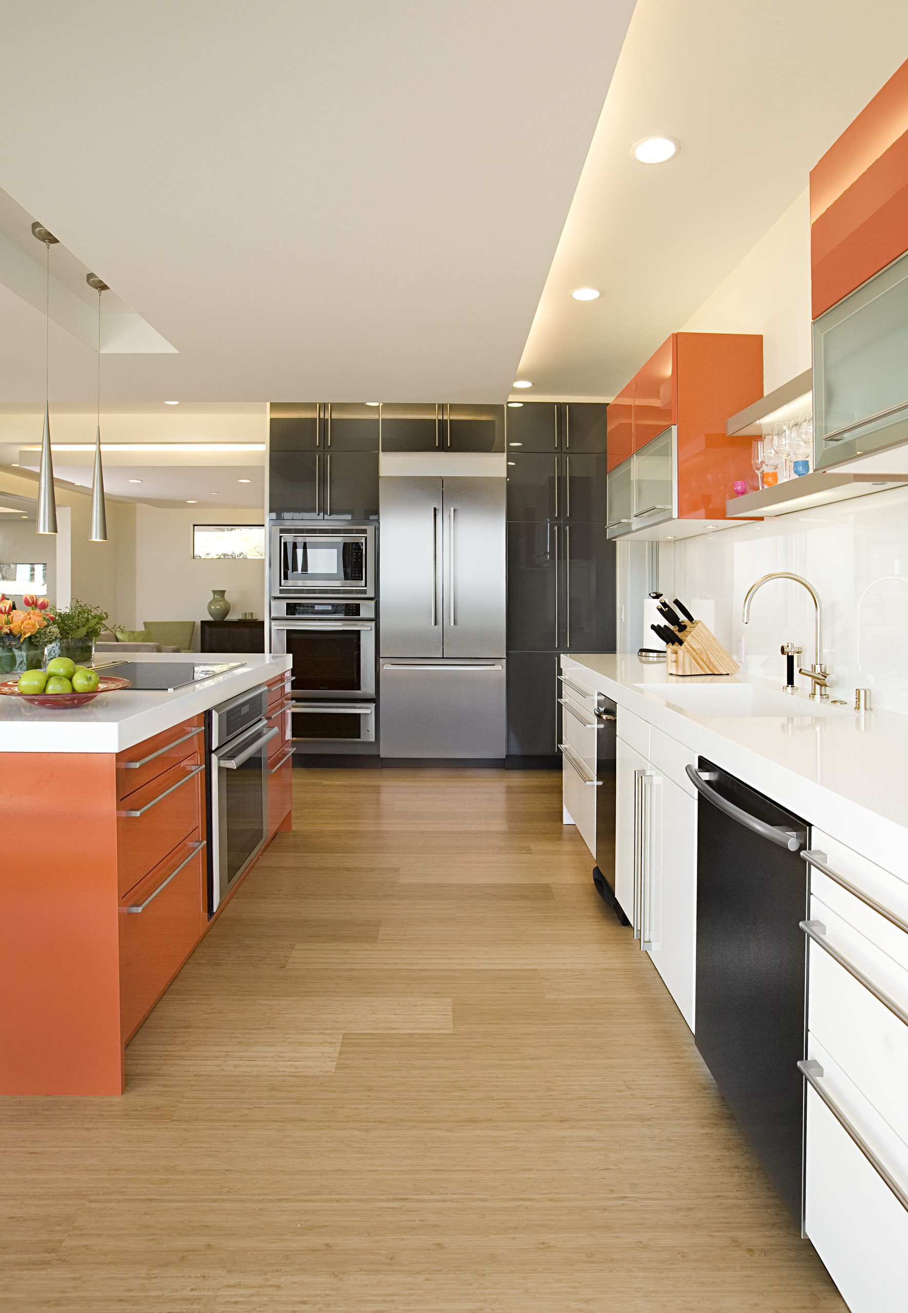The organic texture of this kitchen’s bamboo floor juxtaposes nicely with the high-gloss cabinetry.