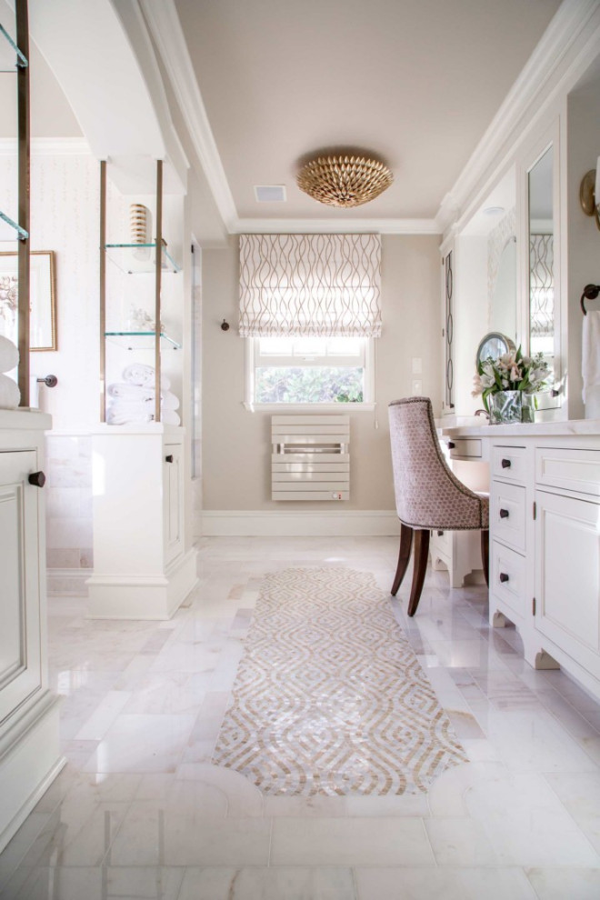 The tub area was part of a remodel in which Peltier injected sophistication and glamour into the space using subtly patterned drapes and shades. “With all the stone detail in this project, it can make the space feel cold,” she says. “Our main focus was on privacy and warming the space. We used Roman shades that fit to the window and fold up. Then panels for an aesthetic and feminine touch.”