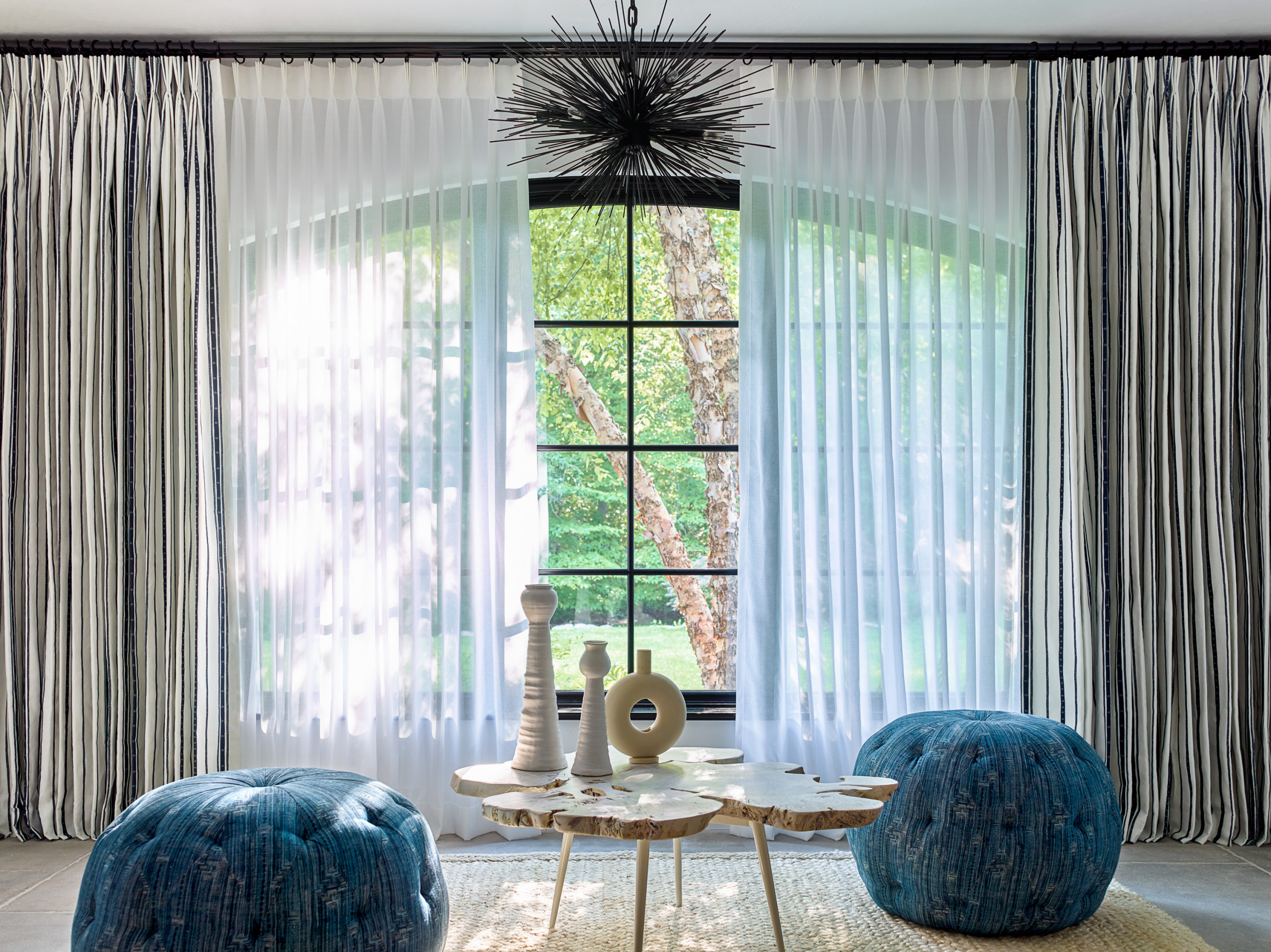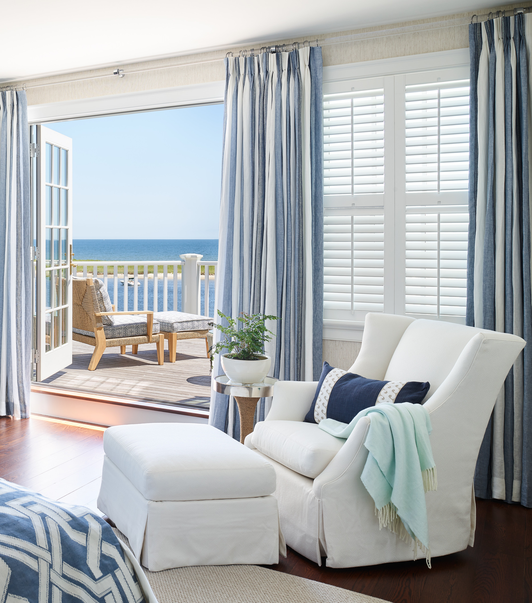 In the same home, the designers framed seaside views with coastal blue-striped pleated drapes and bright white shutters.