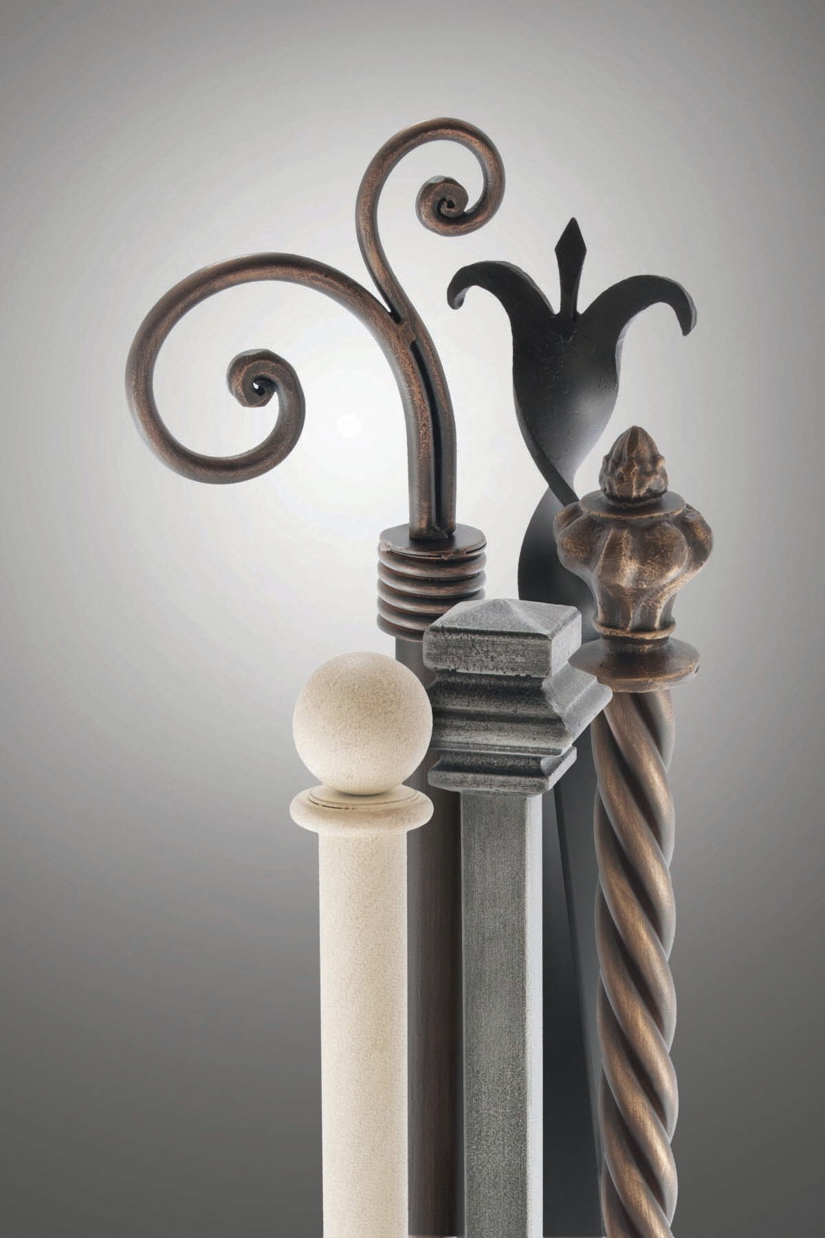 Finials and rods come in many finishes and shapes, such as these examples from Budget Blinds.
