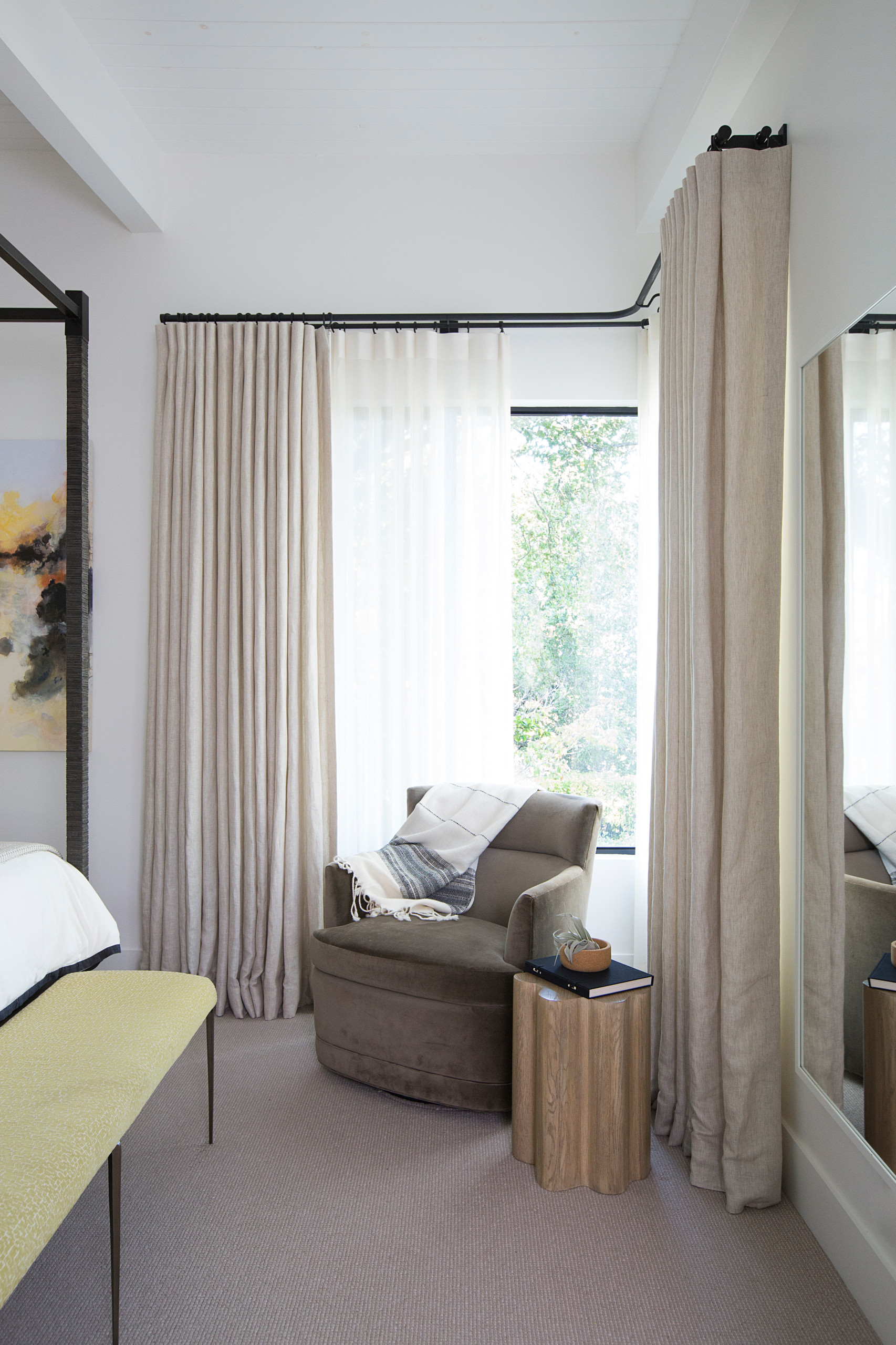 These ripple fold drapes and sheers hang from rings on rods that extend around a bedroom corner in Portola Valley, California, where the pros at Melinda Mandell Interior Design helped furnish a home for a young family using high-end, handcrafted pieces mostly made locally.