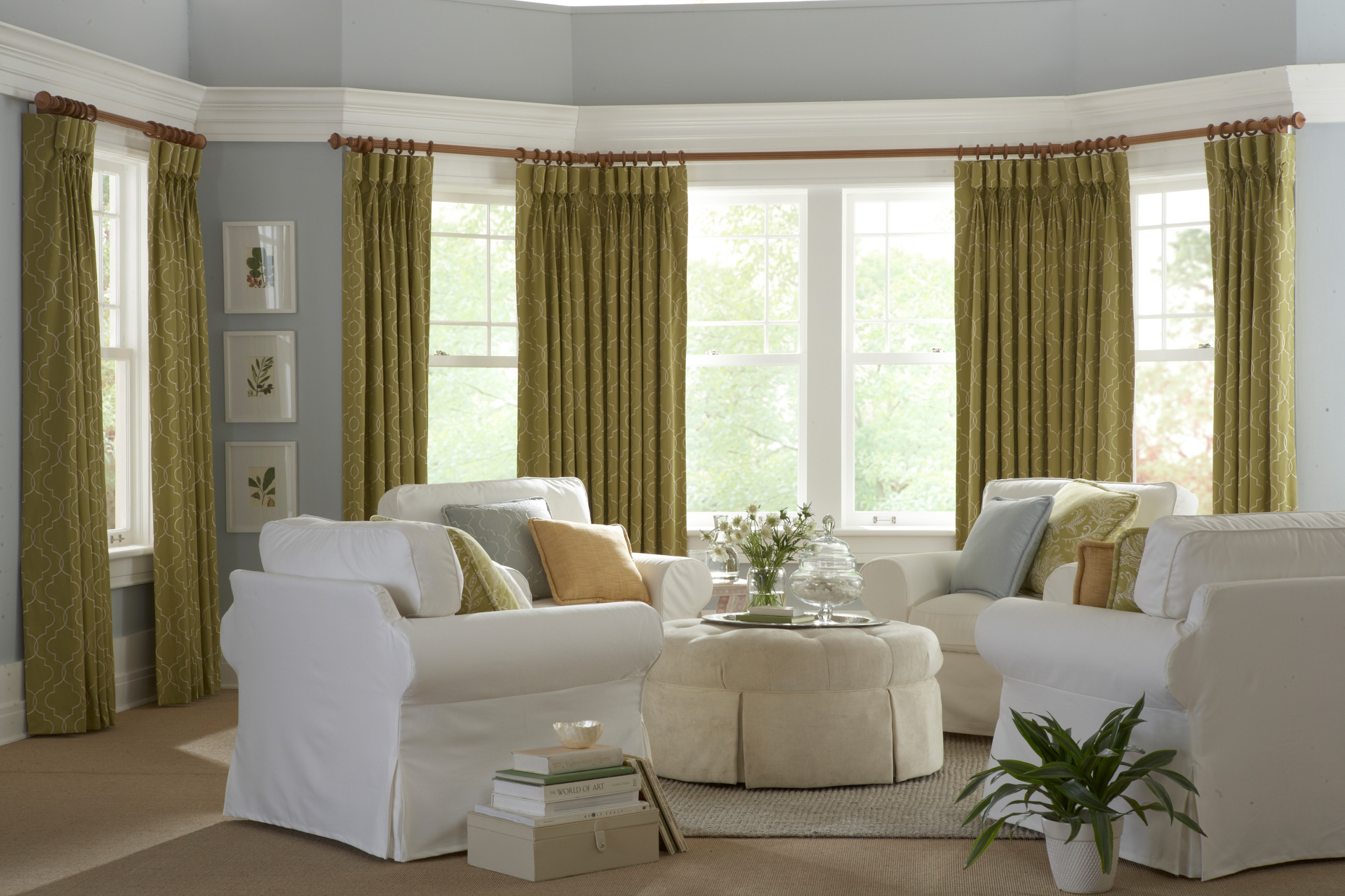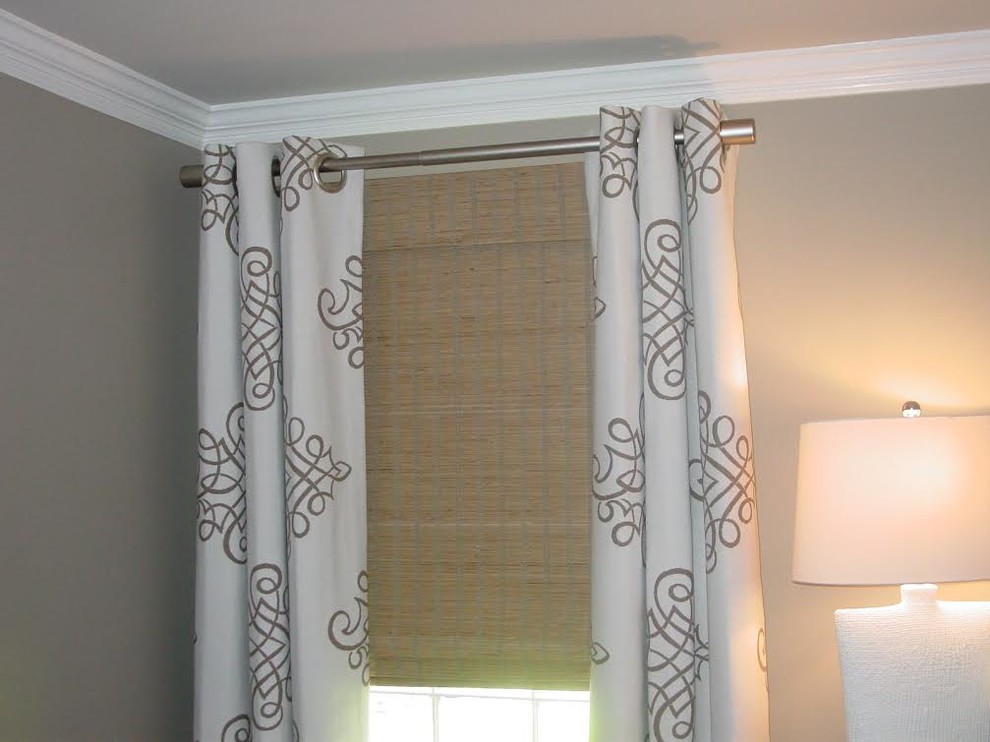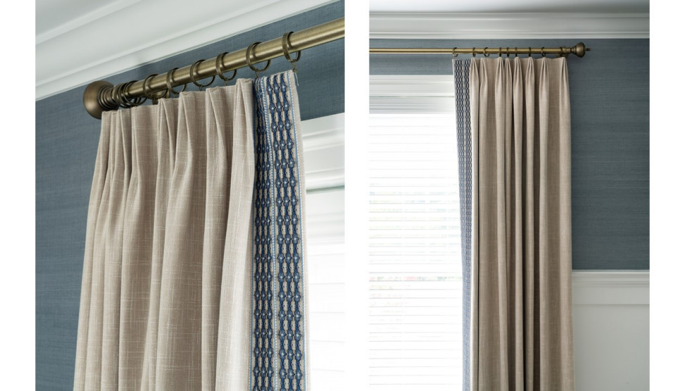 Unlike shades, blinds or shutters, which can be directly mounted to the inside or outside of a window frame, curtains and drapes hang from rods attached to the wall above the frame or even from the ceiling in the case of traversing drapes on a track, as seen here. The pros at Finishing Touches mounted two track-type rods on the ceiling with enough space between them for sheers and drapes.
