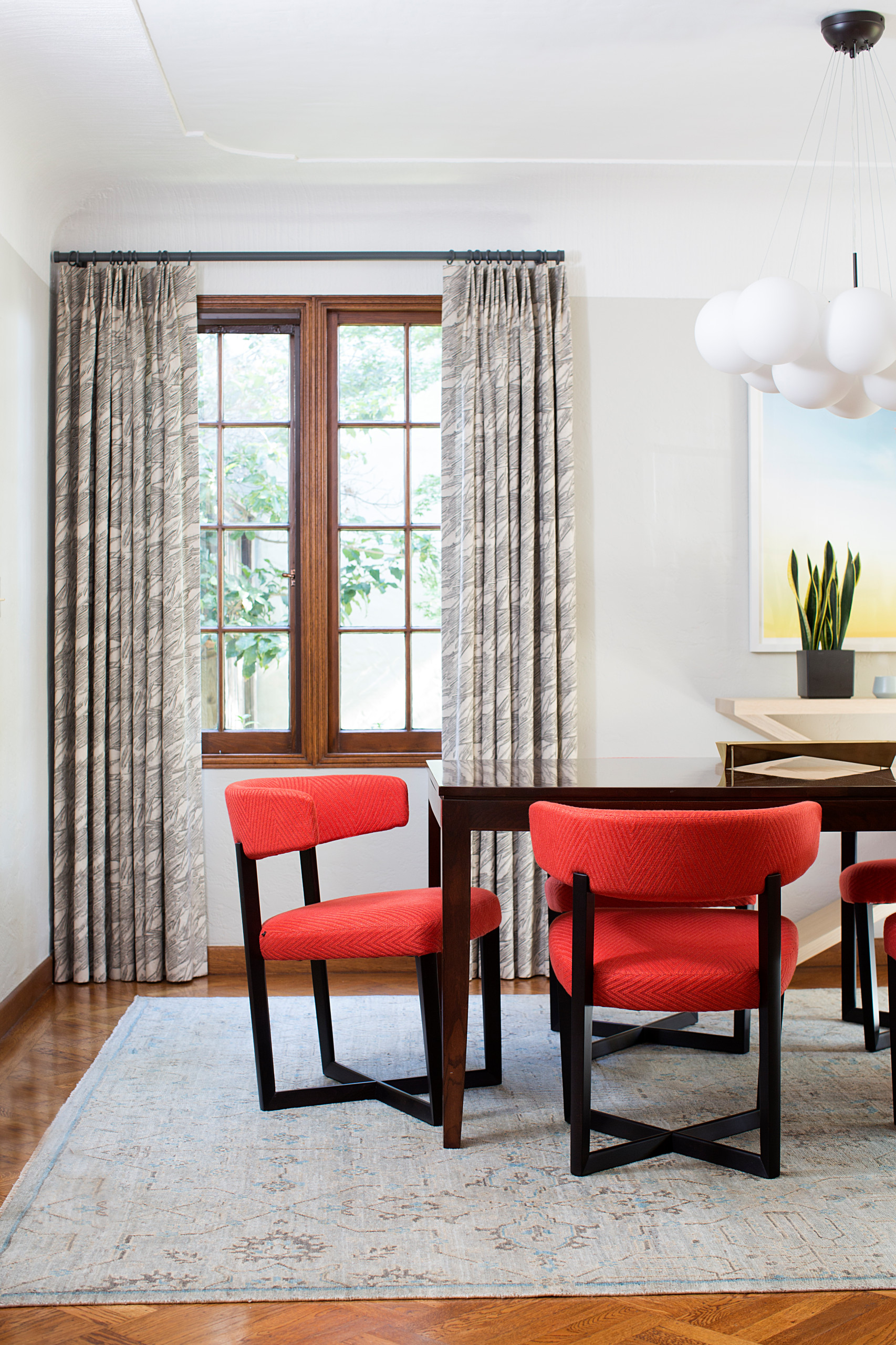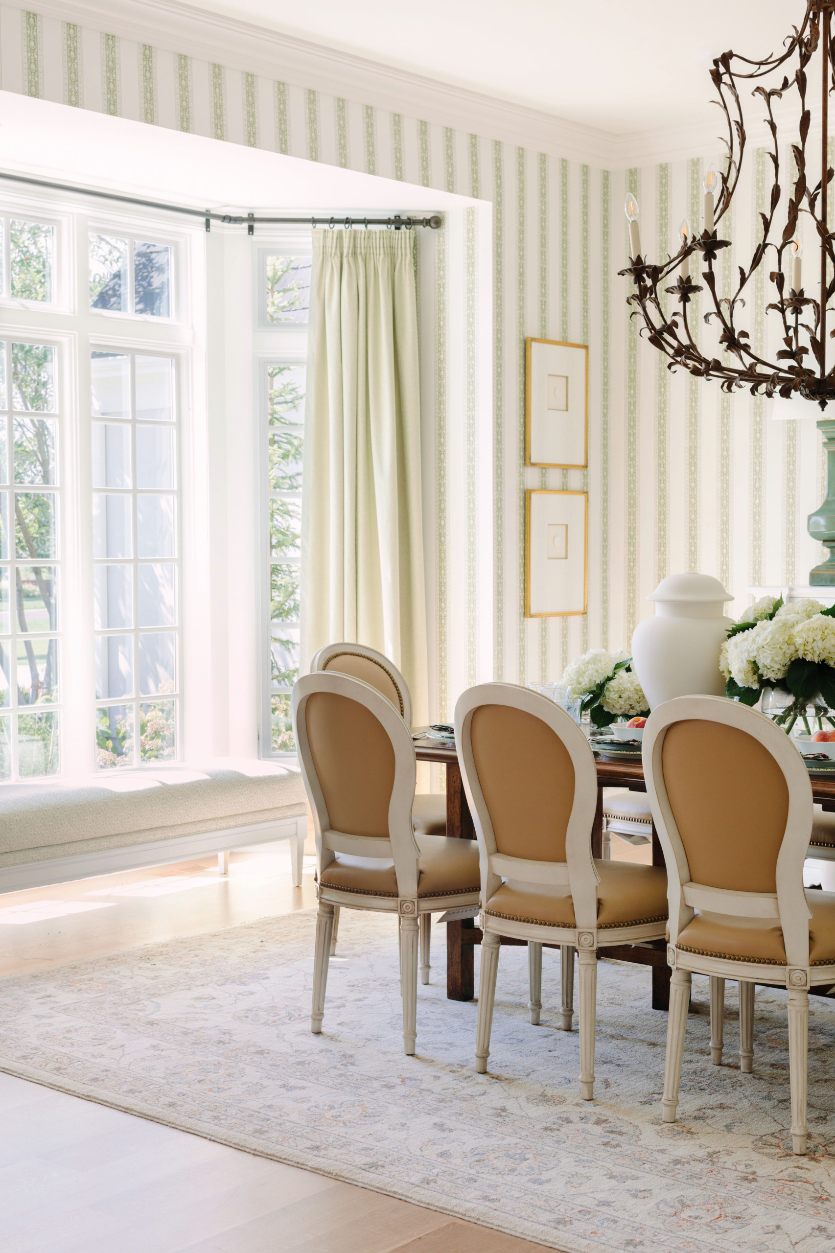 Some window treatment companies offer custom rods that extend around corners, particularly useful for bay windows, such in as the dining area shown here in a renovated Kansas City, Kansas, home that got expert help from Bria Hammel Interiors.