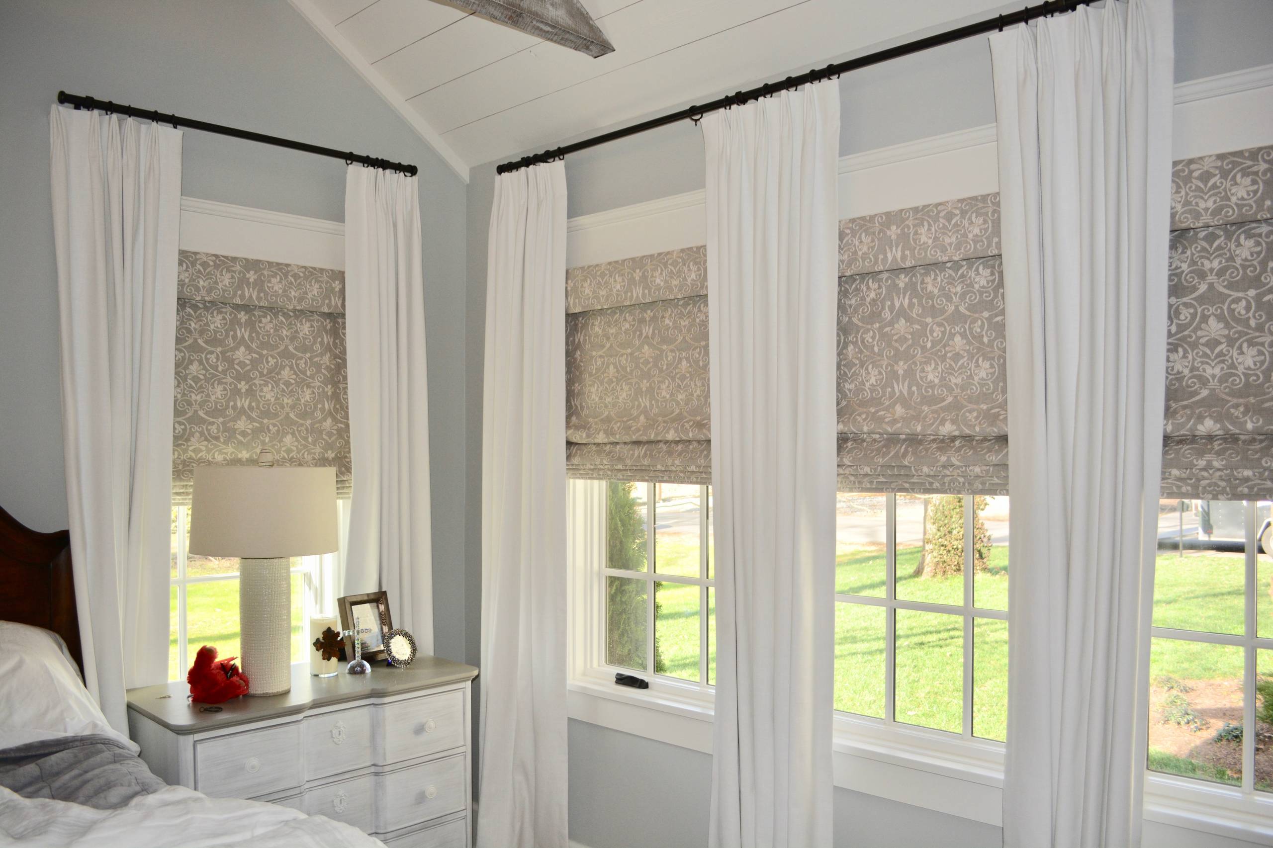 Crisp white draperies pair with flat-fold Roman shades on new windows in the bedroom of a historical Craftsman in Atlanta, modernized with the help of the designers at Wynter House Designs.