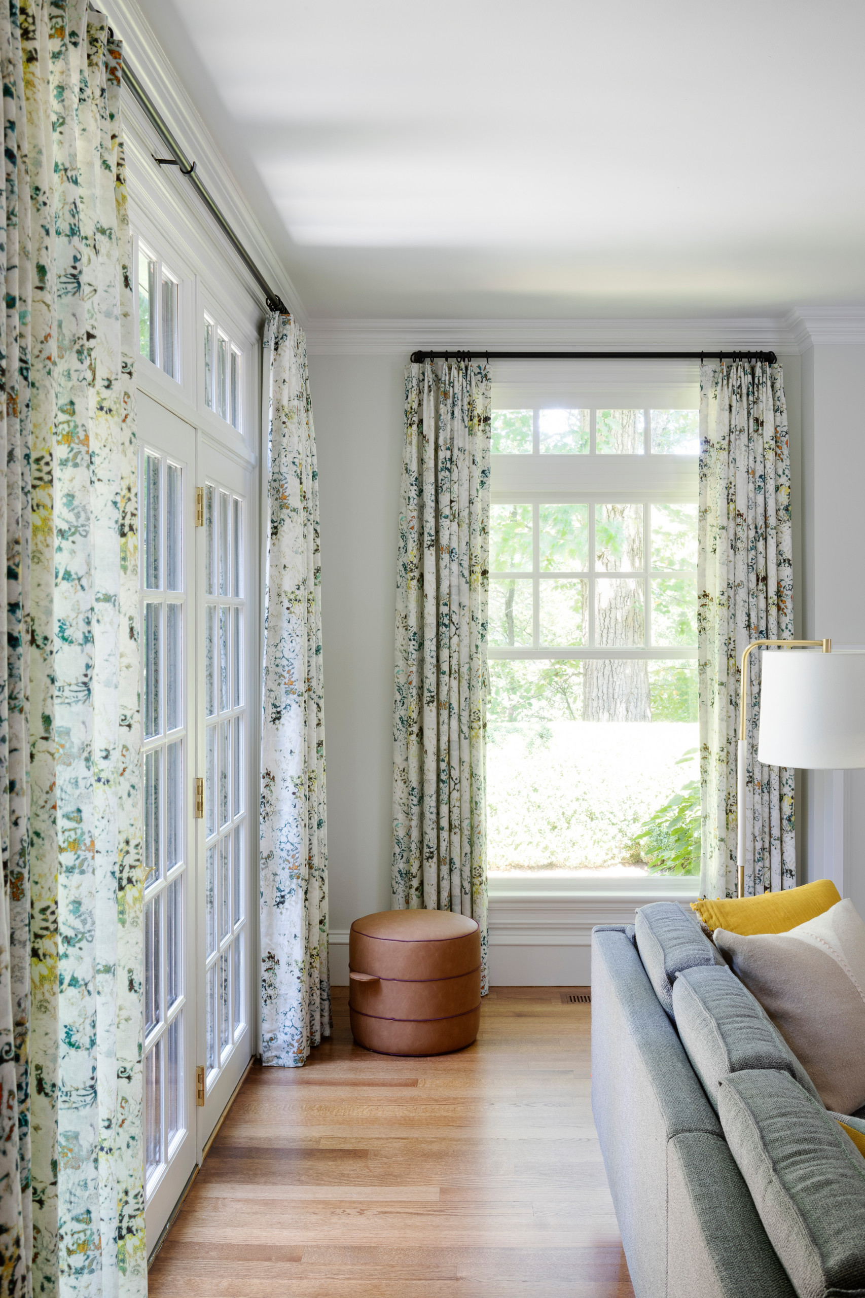 Pretty patterned drapes hang from black rings and rod in this living room in a partially renovated home in Wellesley, Massachusetts, with interior design by Eleven Interiors. A bracket supports the rod in the middle over the French doors, a common feature when drapes are hung on doors or a wide window.