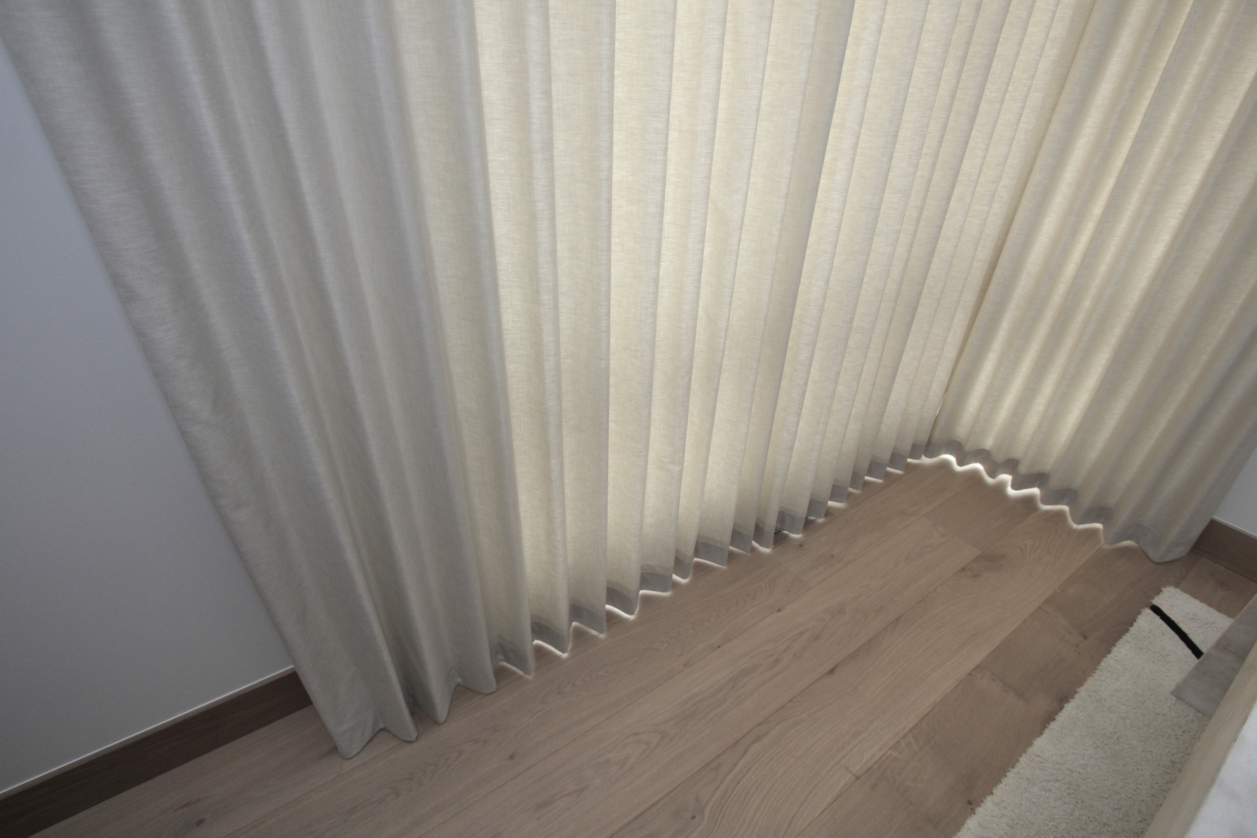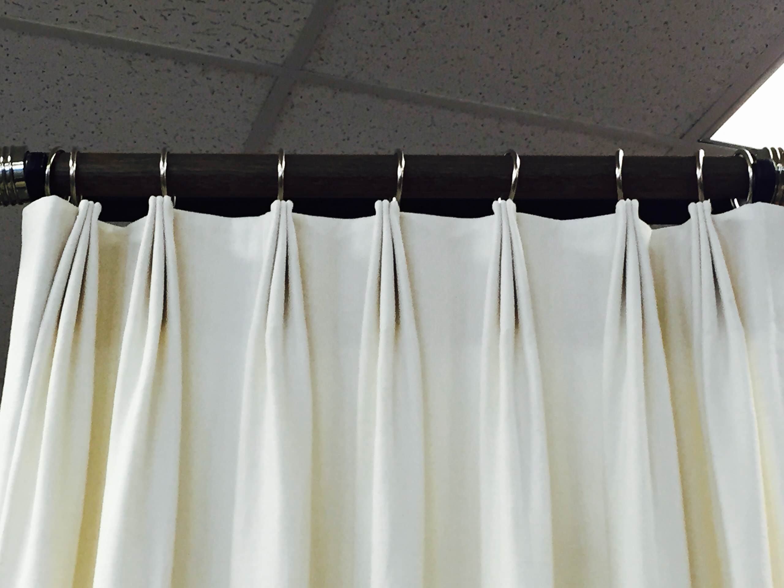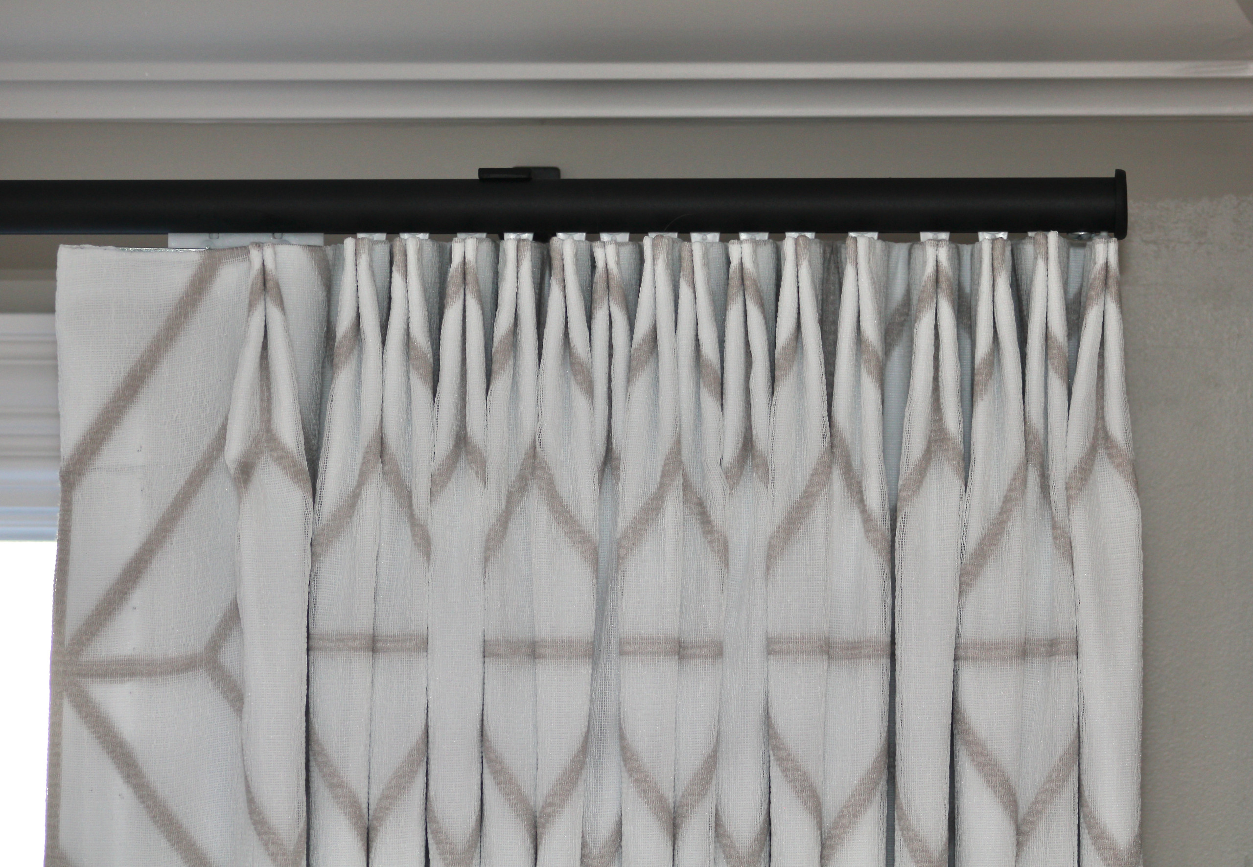 Pleated. Pleated headers are one feature that distinguish drapes from more casual curtains, though some curtains do have pleats. Pleats in general present a more traditional, luxurious aesthetic, with some styles providing a more modern feel. Pinch pleats, also known as French pleats, are like small fans at the top and are made in different widths, called two-finger and three-finger. The drapes and sheers from The Shade Store seen here both have pinch pleats.