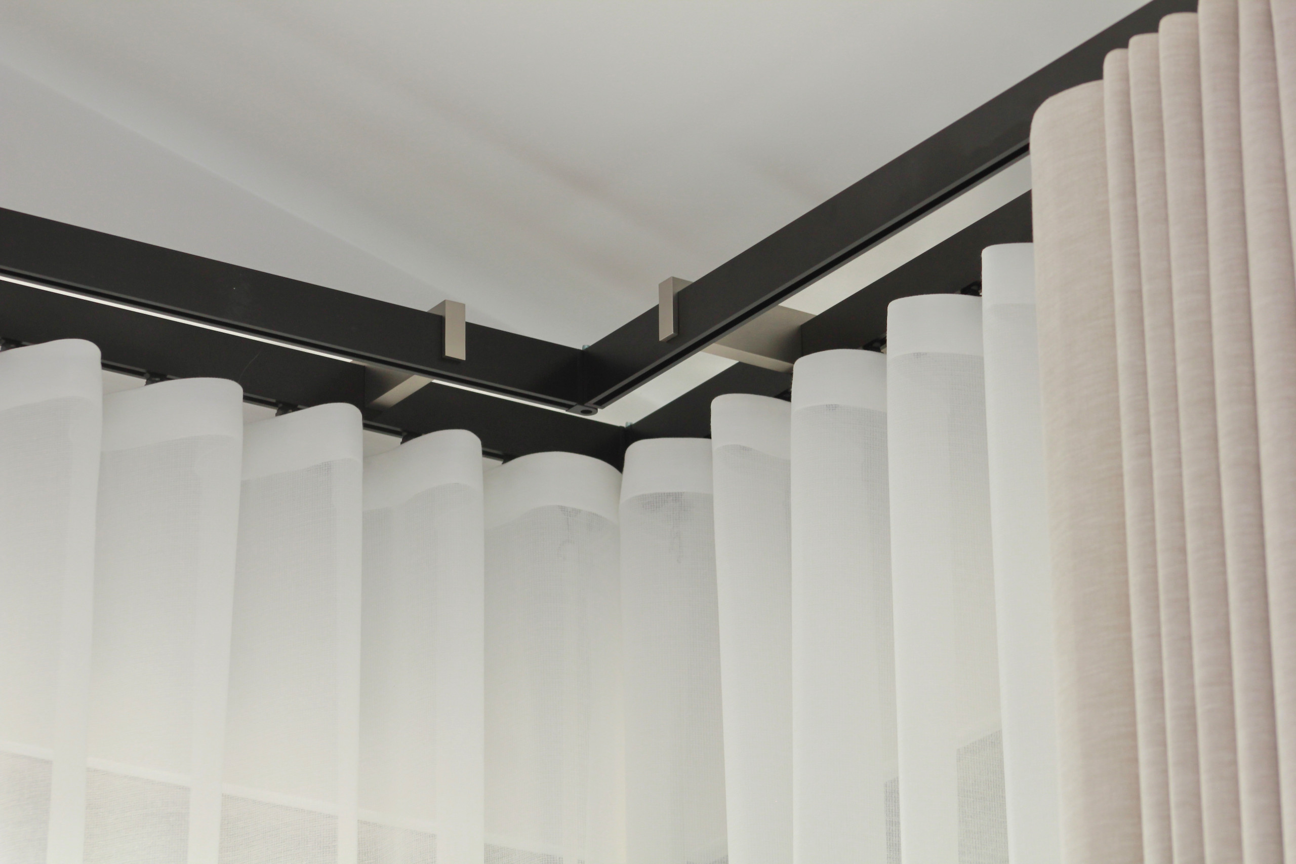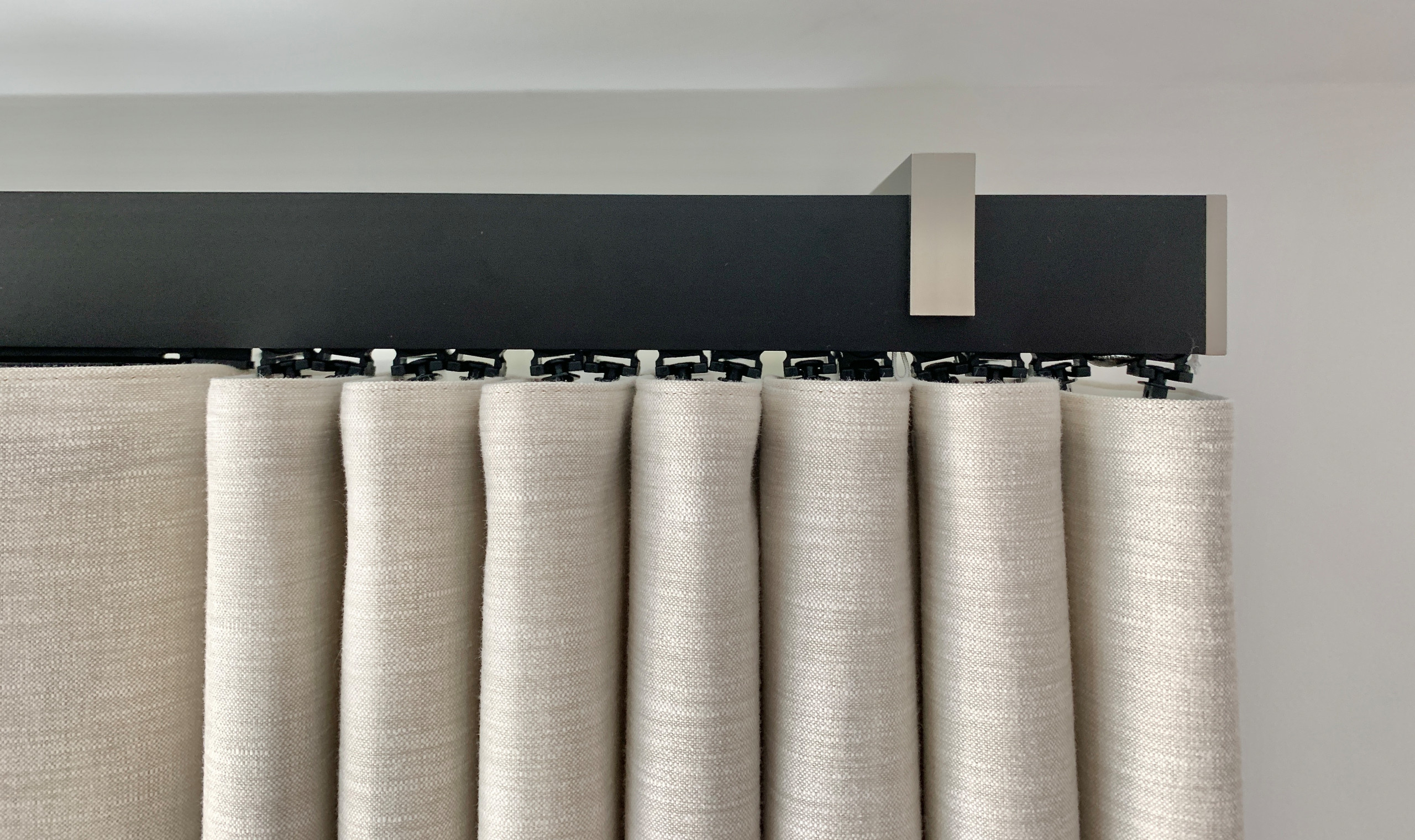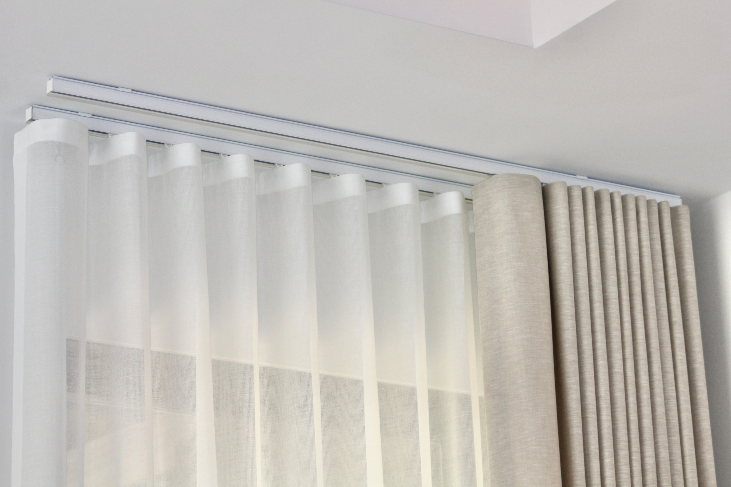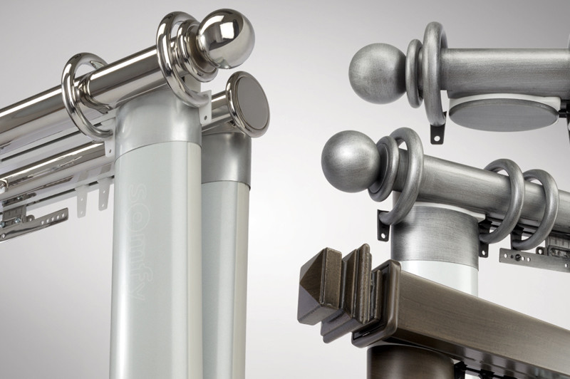 Traversing drapery hardware comes in a variety of finishes and designs, such as these from Somfy, a company that produces motorized window treatments.