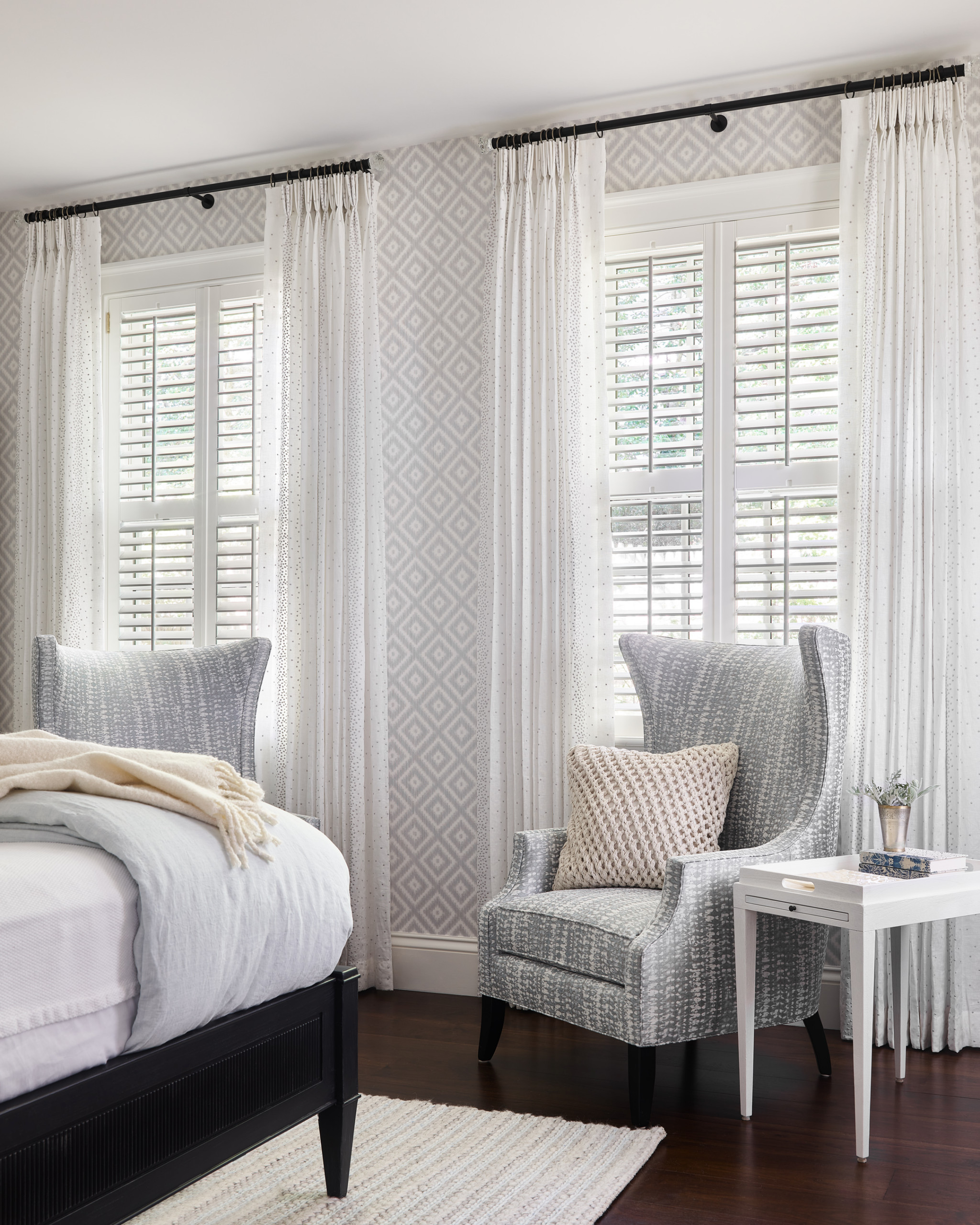 Soft white pinch-pleat drapes hung close to the ceiling to maximize height are paired with white shutters and stand out against the geometric-patterned wallpaper in this Osterville, Massachusetts, bedroom by Casabella Interiors.