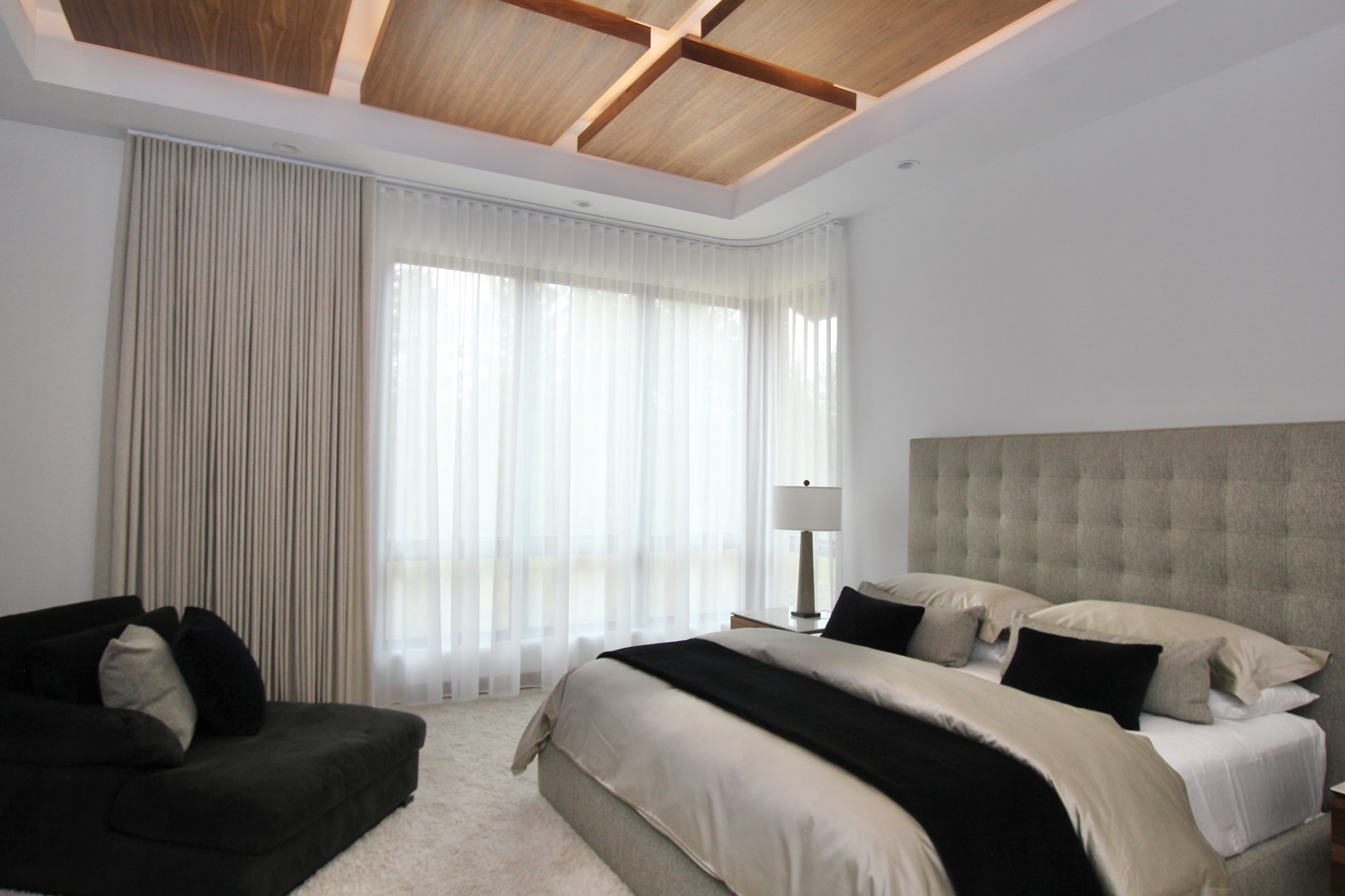 Double traverse rods can accommodate sheers behind drapes, as seen here in a bedroom in Castle Pines, Colorado, where designer Stouffer ceiling-mounted double 90-degree bent rods with traversing ripple fold sheers and linen drapes.