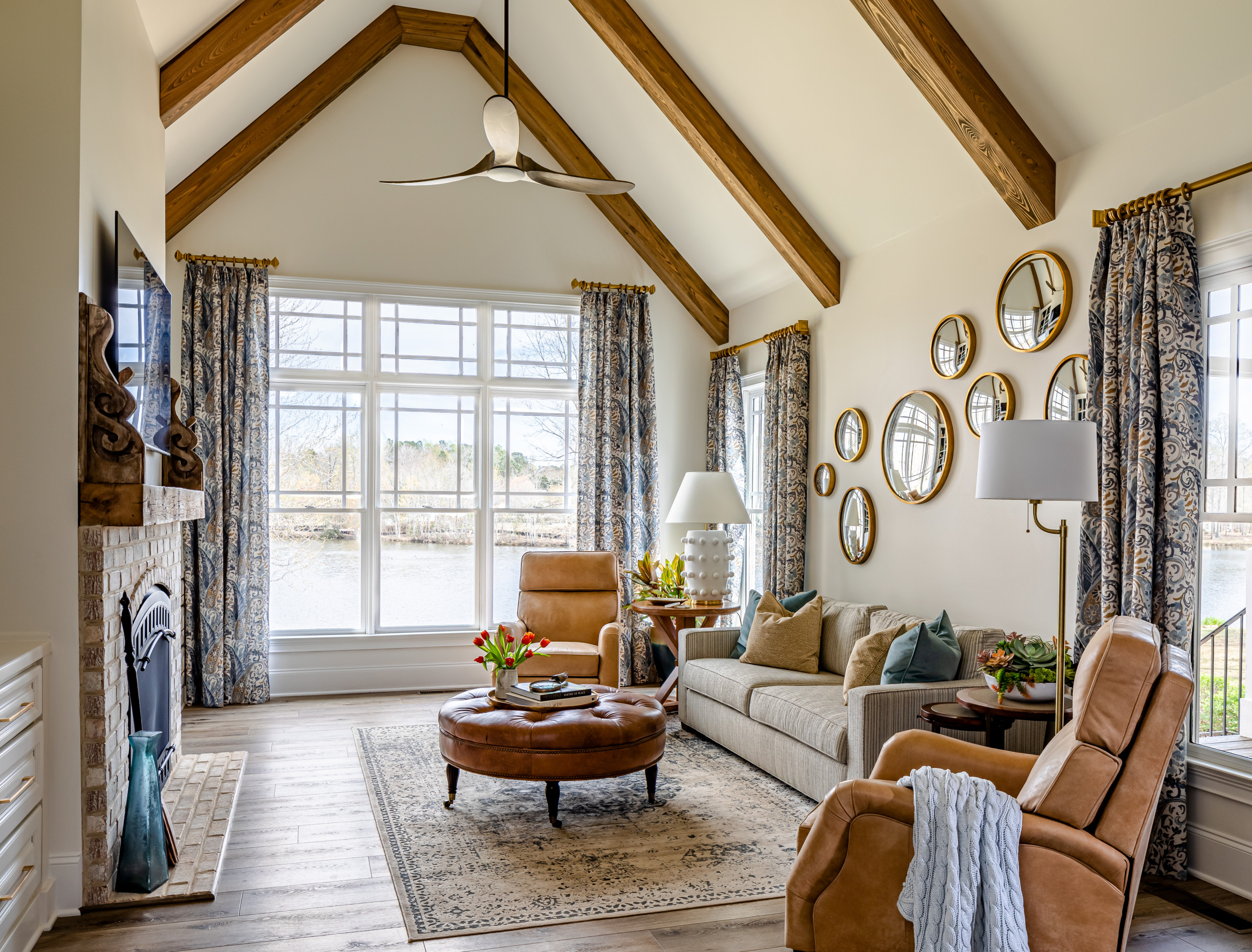 The grommet silk drapes here hang from custom rods made by Highland Forge, which hand-fabricates curtain and drapery hardware in Atlanta. The window treatment includes top-down/bottom-up honeycomb shades mounted inside the window frame.