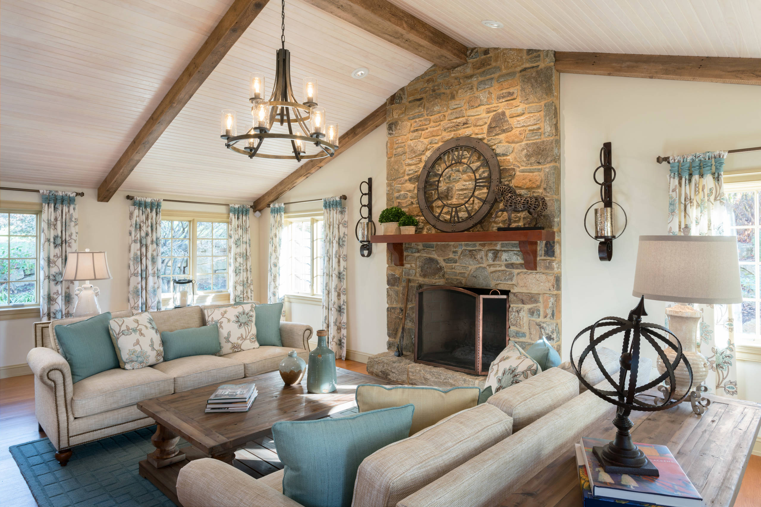 Here’s a look at the living room with the blue-linen-wrapped tabs on the floral drapery. Gil-Jones worked on the interior design of the living room, which was an addition to an 1890s farmhouse. The blue tabs pick up the blue in the fabric panels and complement the area rug.
