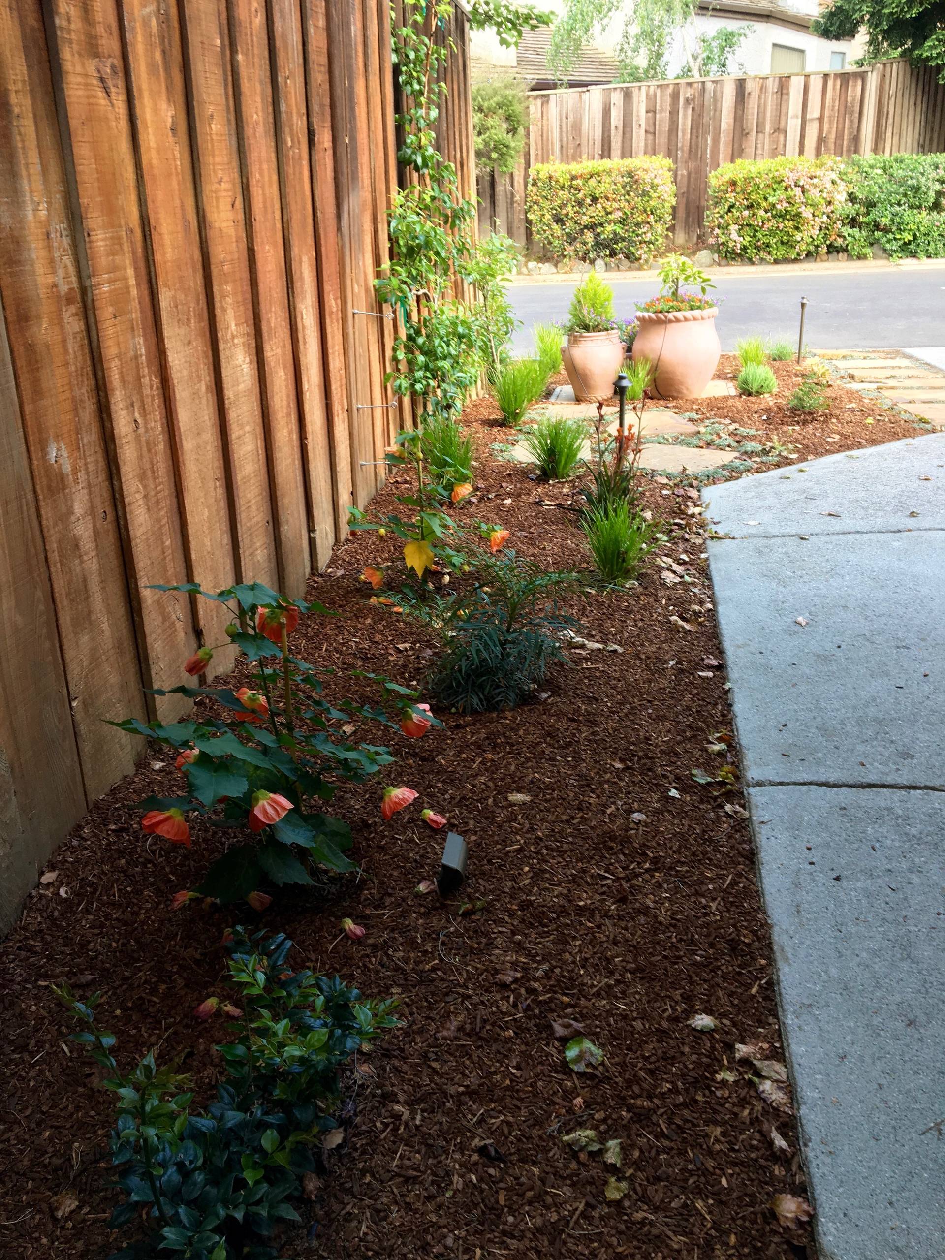 Wintertime sheet mulching killed the many weeds near the entrance to this home and also enriched the hard soil, a plus for the newly planted shrubs and perennials.
