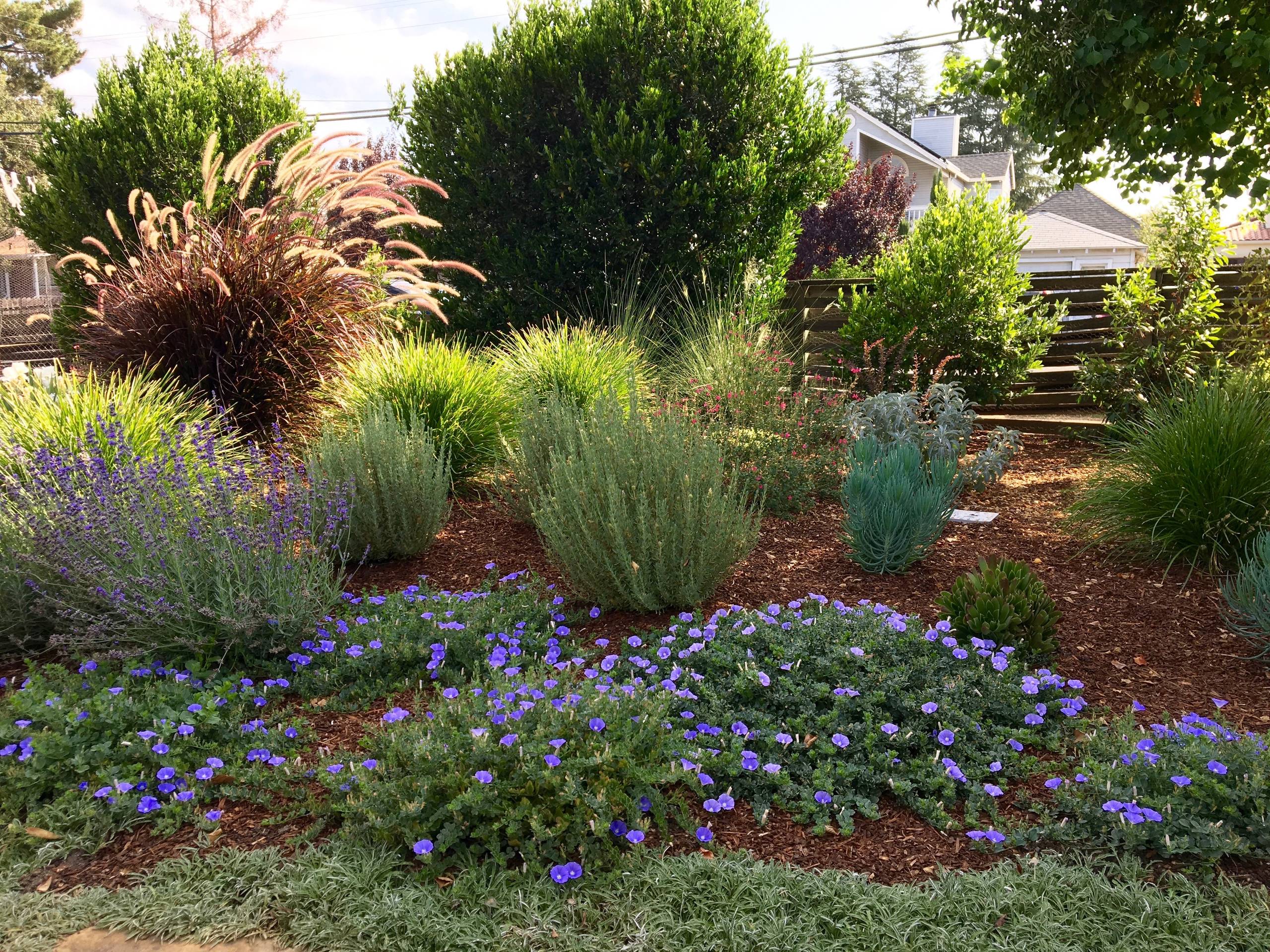 A thirsty lawn was replaced by low-water plants at the top of the hill to control erosion, and by more water-loving plants at the bottom to capture runoff. A bonus is the beneficial insects the plants attract.