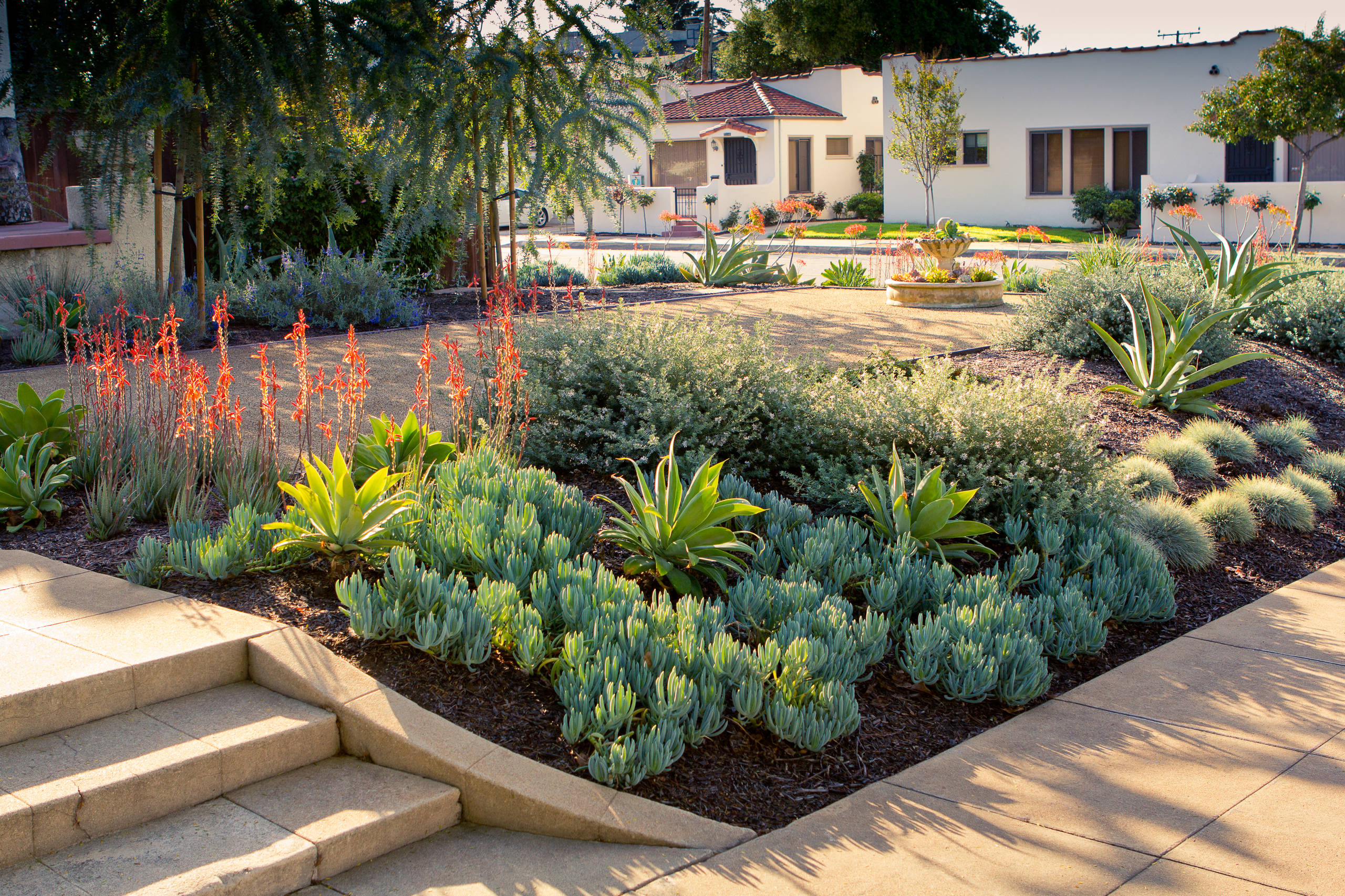 Low-water shrubs paired with aloes and agaves are a vibrant replacement for a front lawn.