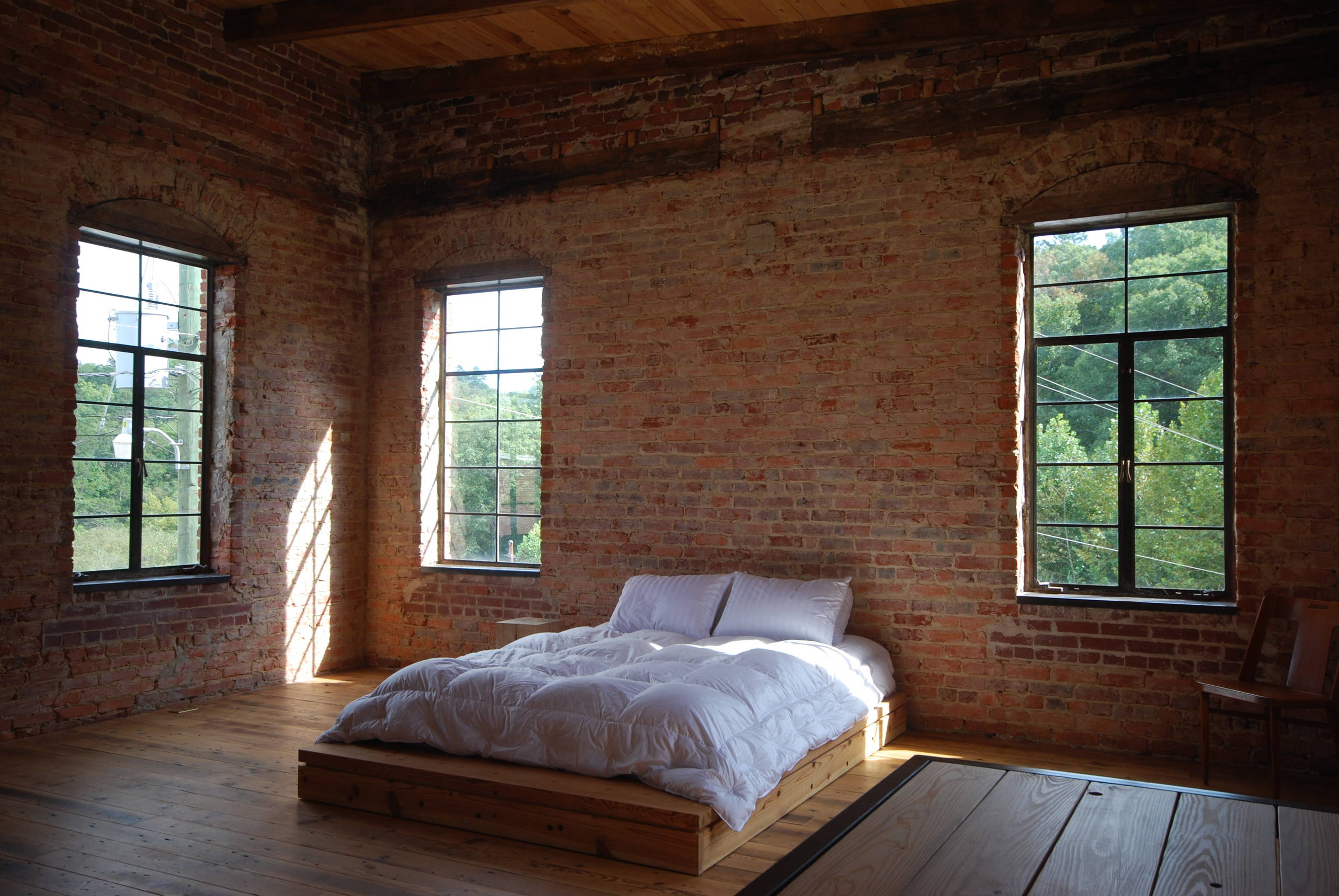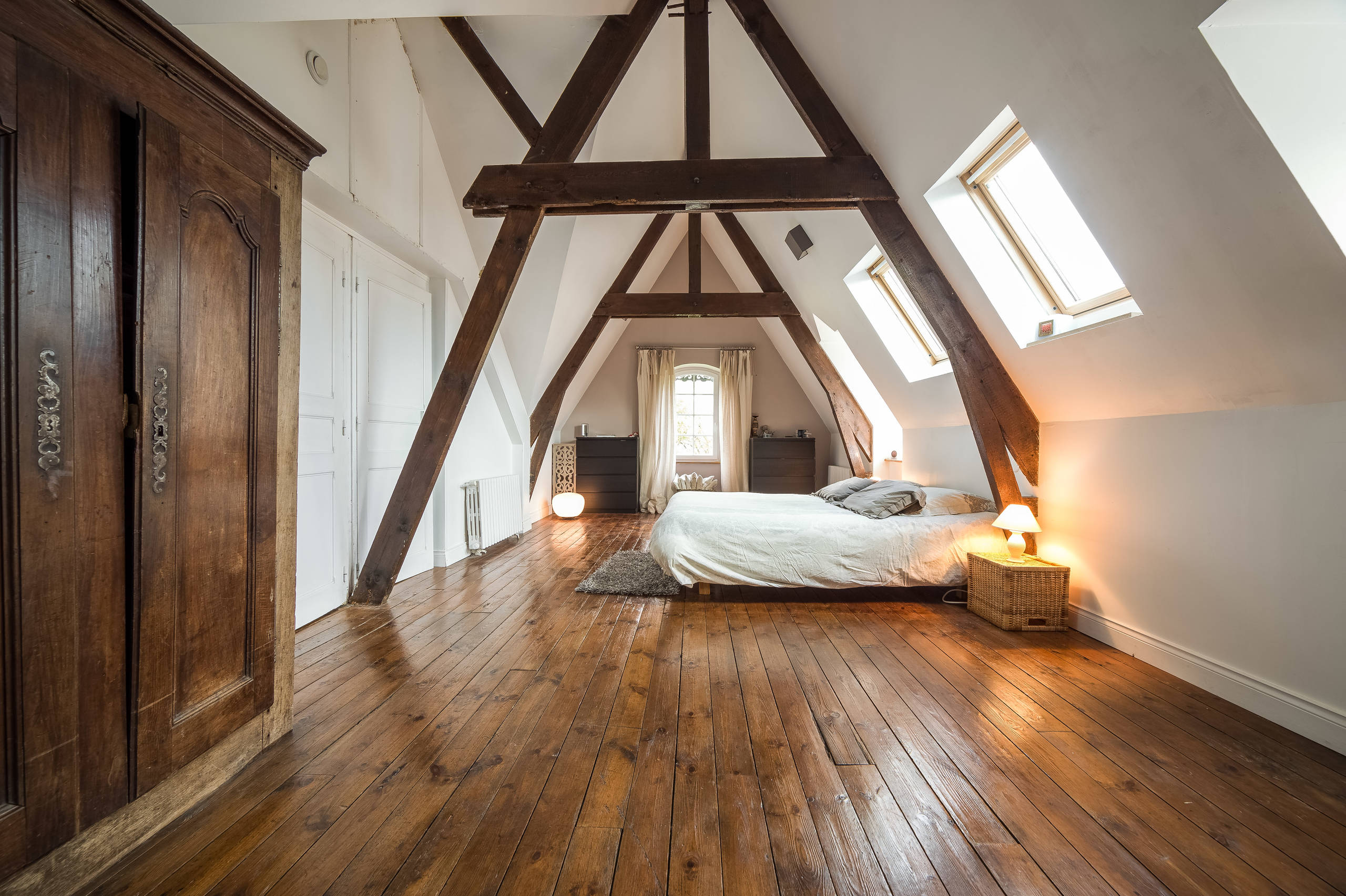 This bedroom is almost monastic and for many would be going a step too far — or would it? The mellow scene of aged bricks, beams and boards, peaceful rural views and sunlight through tall windows needs little embellishment (maybe some blinds and a reading light?).