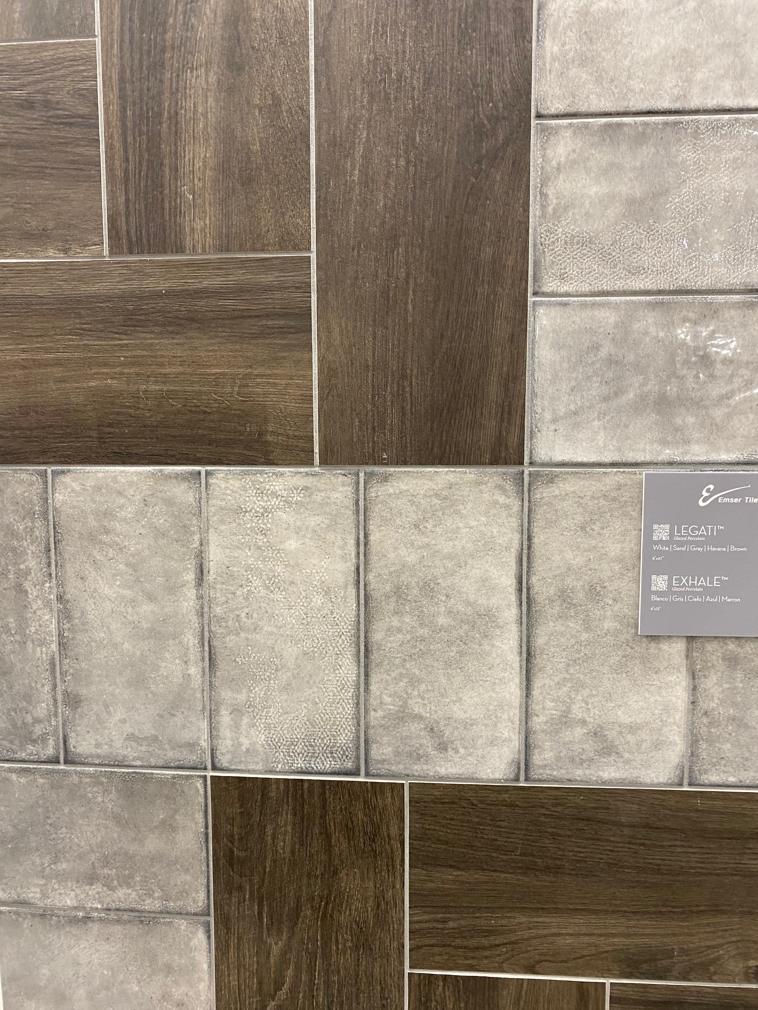 On display here is Emser’s Exhale in Gris, shown along with Legati wood-look tile, a new collection of 8-by-47-inch planks in five colors.