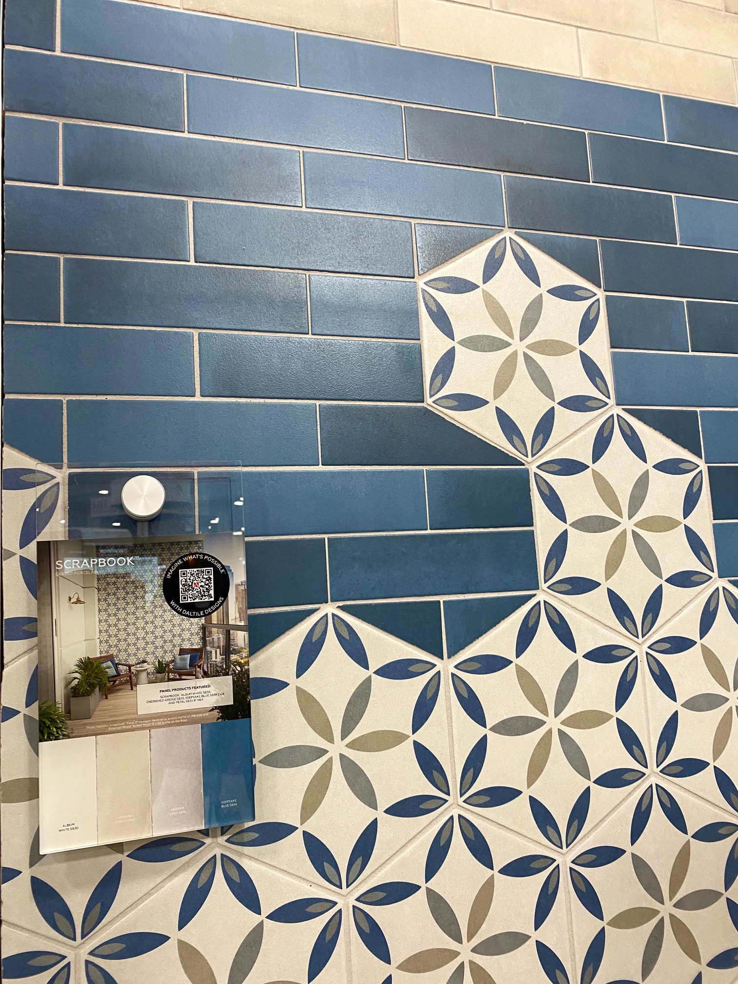 Hexagons are still a dominant shape in many tile collections, available in varying sizes and materials and sometimes with patterned surfaces, such as the 8-inch decorative accent hex called Petal shown here from Daltile’s new concrete-look Scrapbook collection. Also shown is Scrapbook’s Keepsake Blue floor tile.