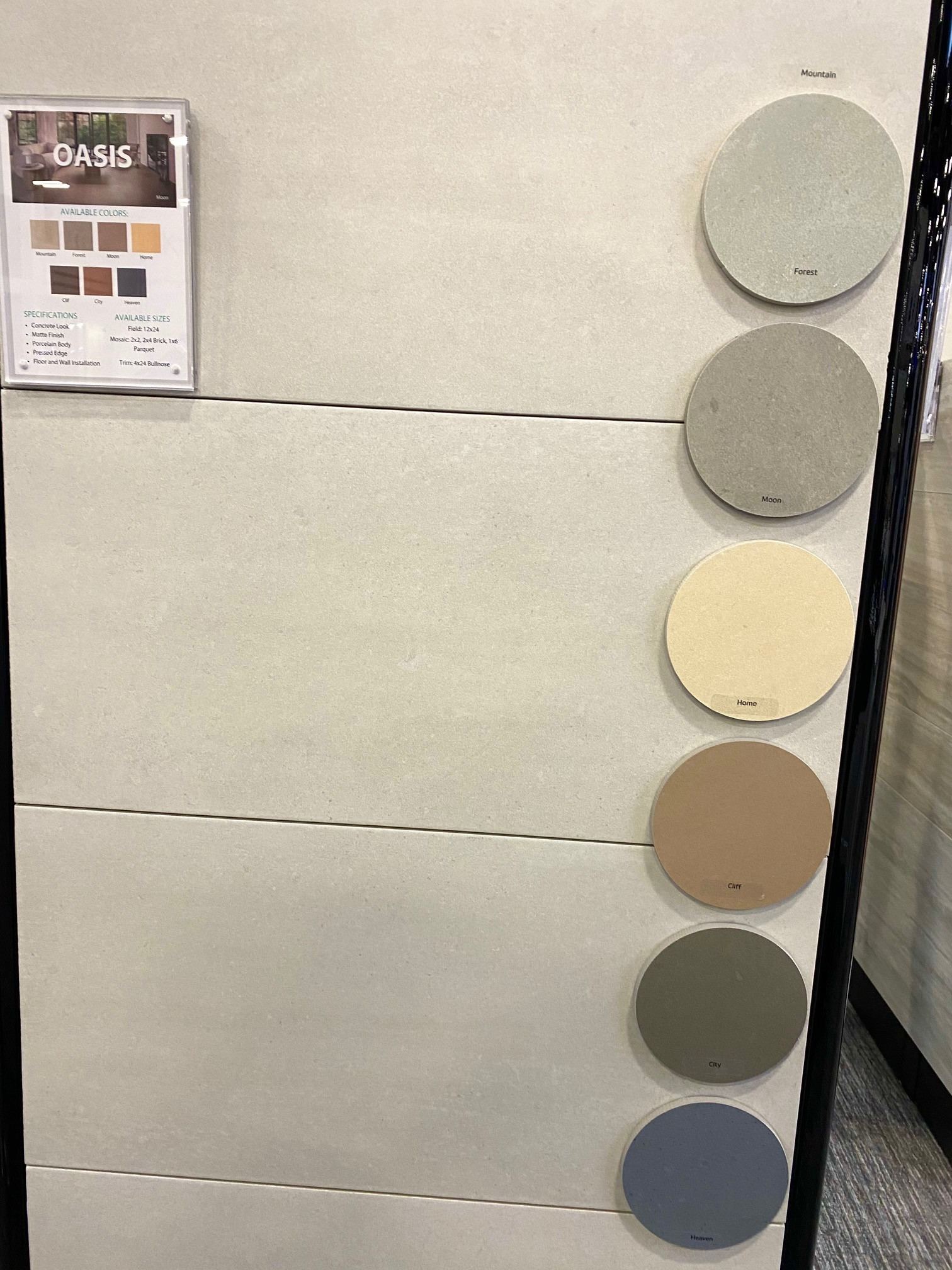 A display from Surface Art’s concrete-look Oasis collection exemplifies the proliferation of new neutrals.