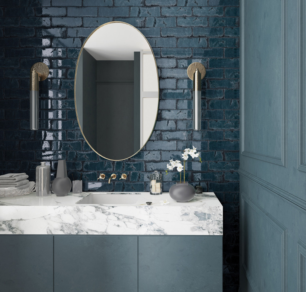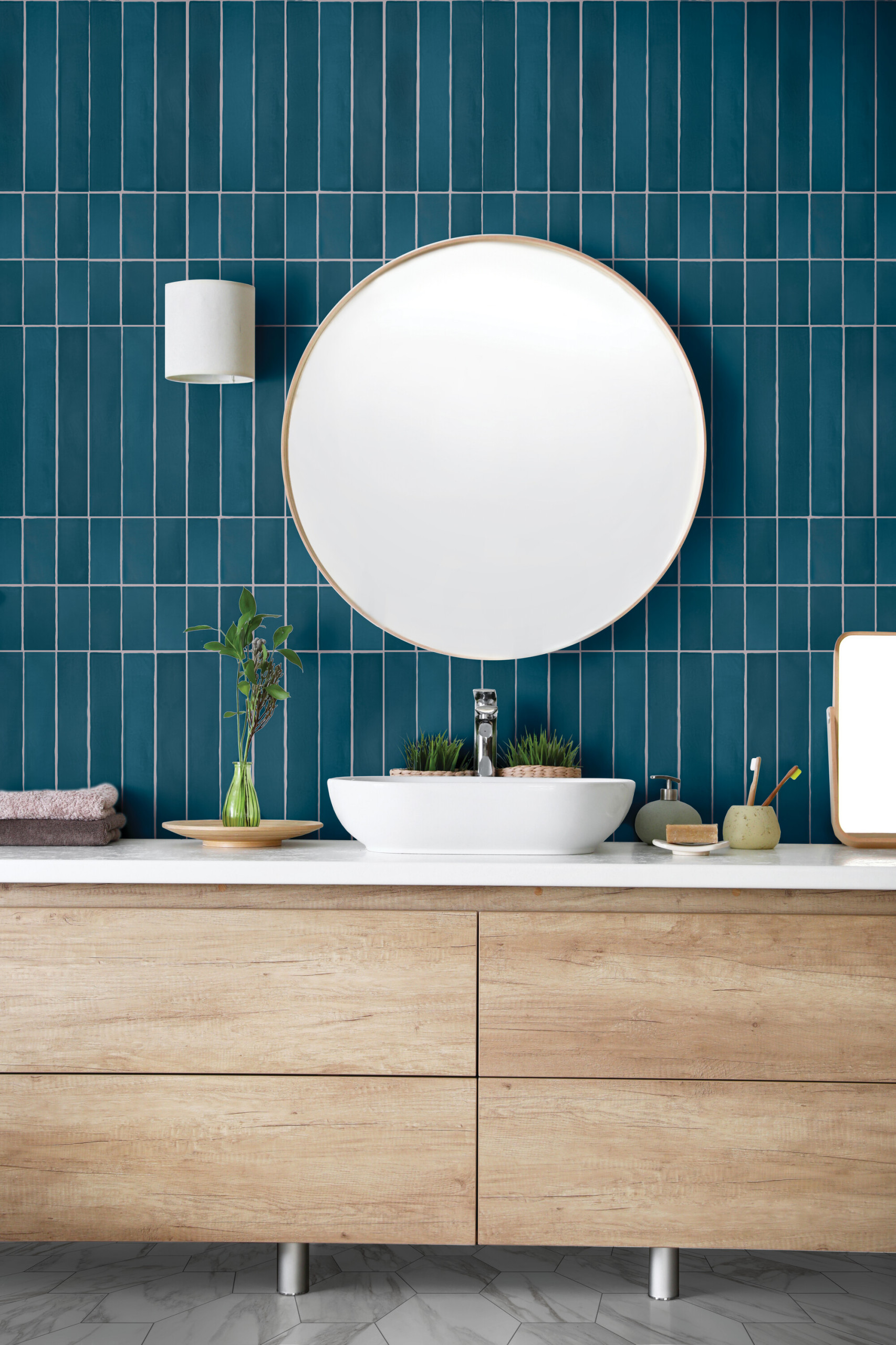 Getting all glimmery is Emser Tile’s new Estasi subway tile, shown here in Navy with a flat surface. The 3-by-12-inch tile is also available in a peaked surface and in five other colors.