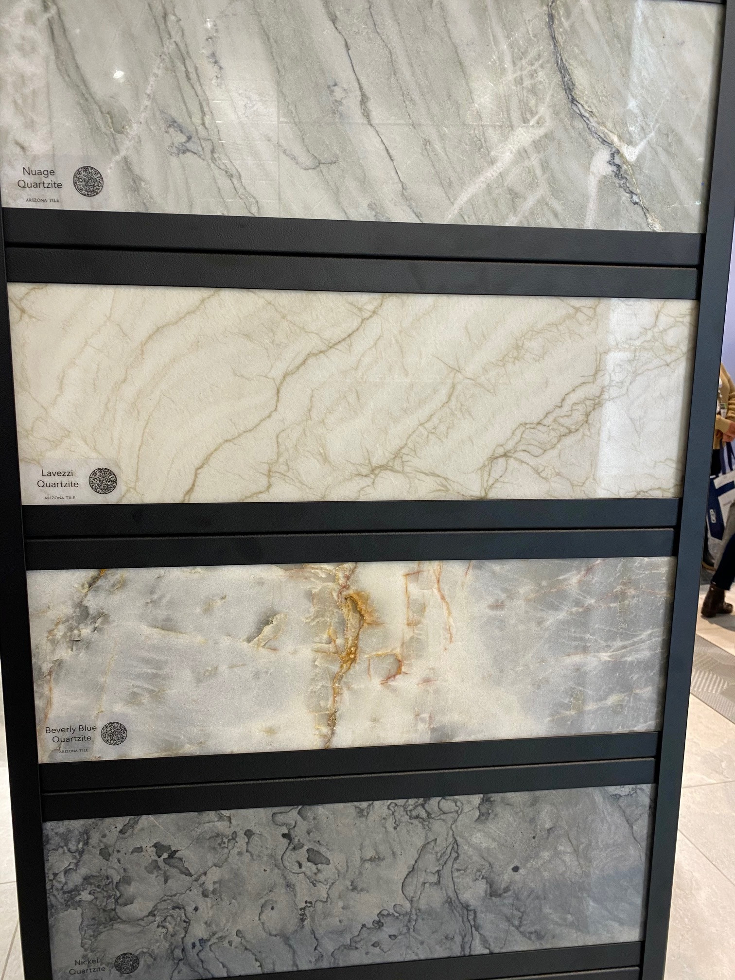 Despite the surge in popularity of imitation stone, natural stone is still preferred by many people, especially for countertops and backsplashes. Here are some quartzite examples from Arizona Tile that were on display at the show, highlighting the stone’s dramatic veining. “Quartzite is definitely a trend, with still some light colors, but people are liking more color. They’re getting a little warmer, a little less white and gray, and now more taupes,” Harrison says.