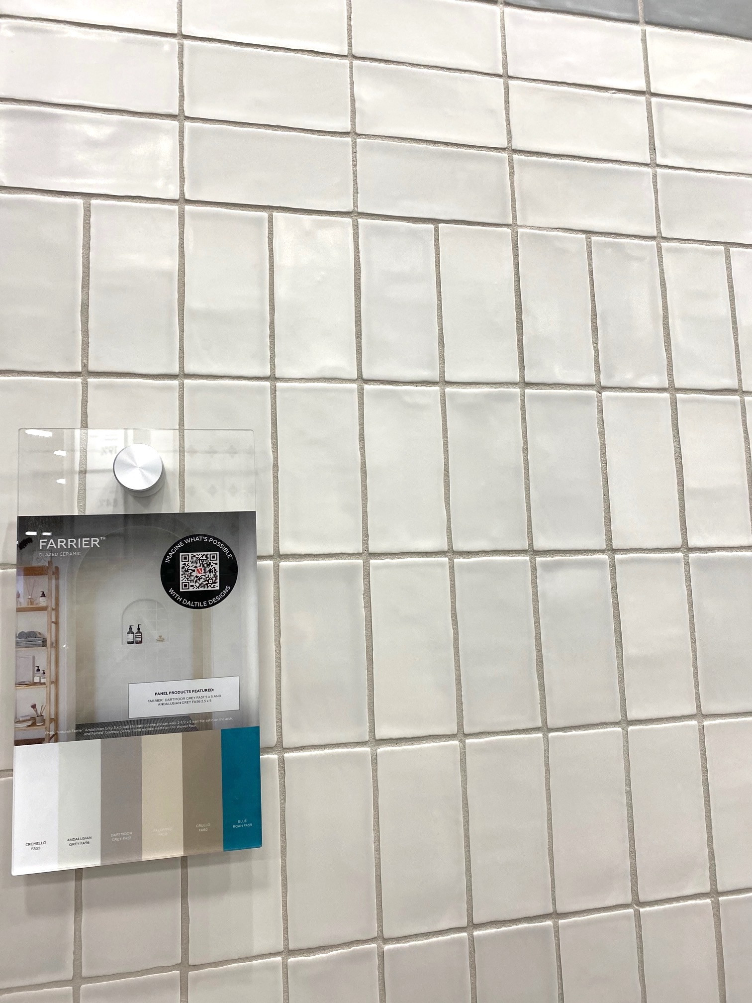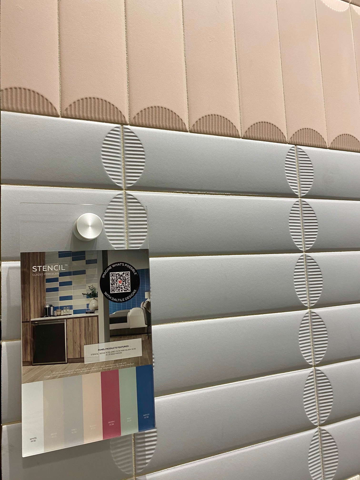 Daltile’s new Stencil collection includes a raised half moon surface, shown here in Blush and Grey. The 4-by-12-inch tiles also come in flat and linear surfaces in a variety of muted colors.