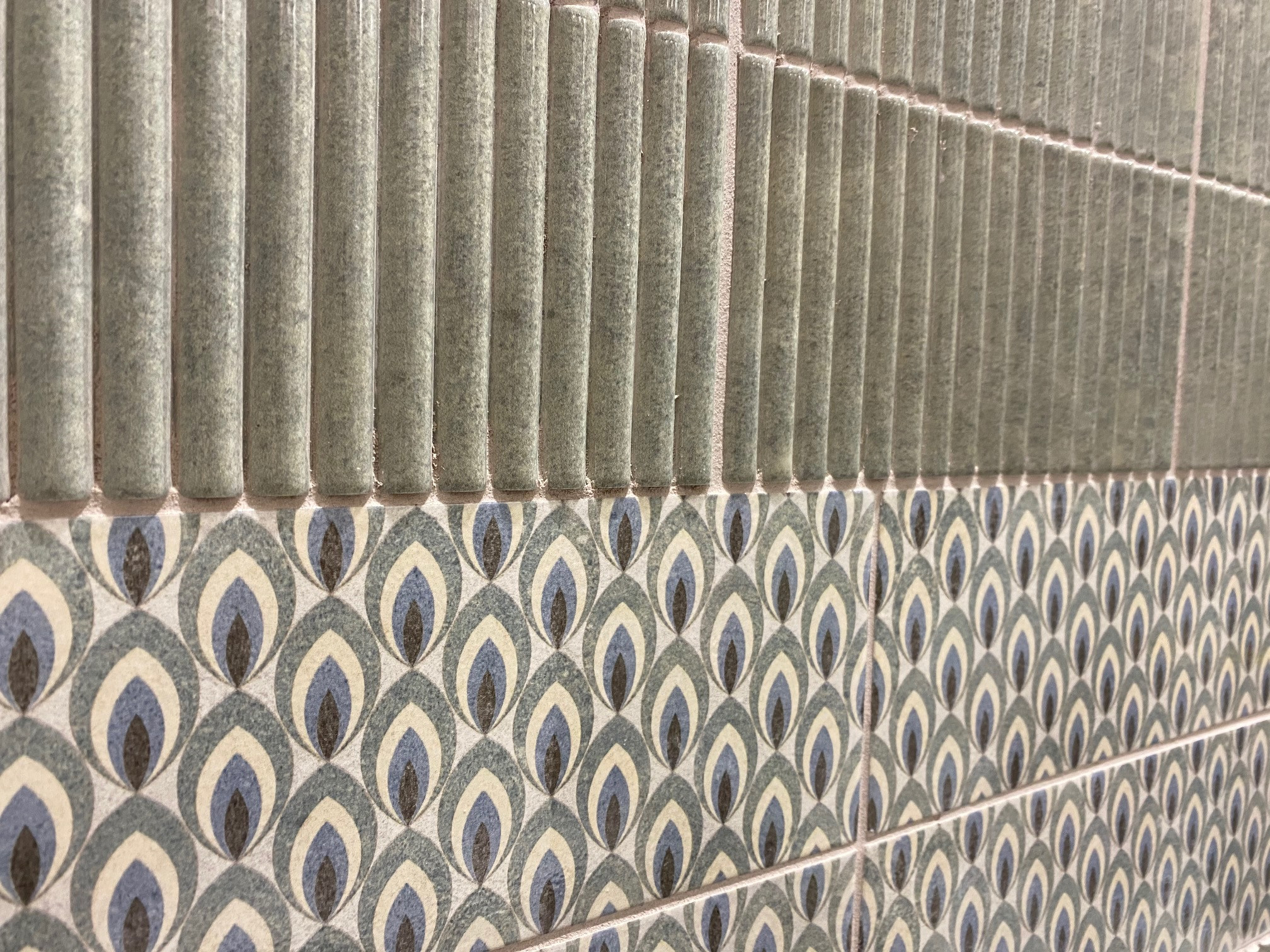 Here’s a closer look at Emser’s Newtro tile, in the Ocean color. “When it first came out, people were afraid it would be hard to clean, but the grooves aren’t that deep; you just wipe it like any other tile. It has that real artisan look,” Greene says.
