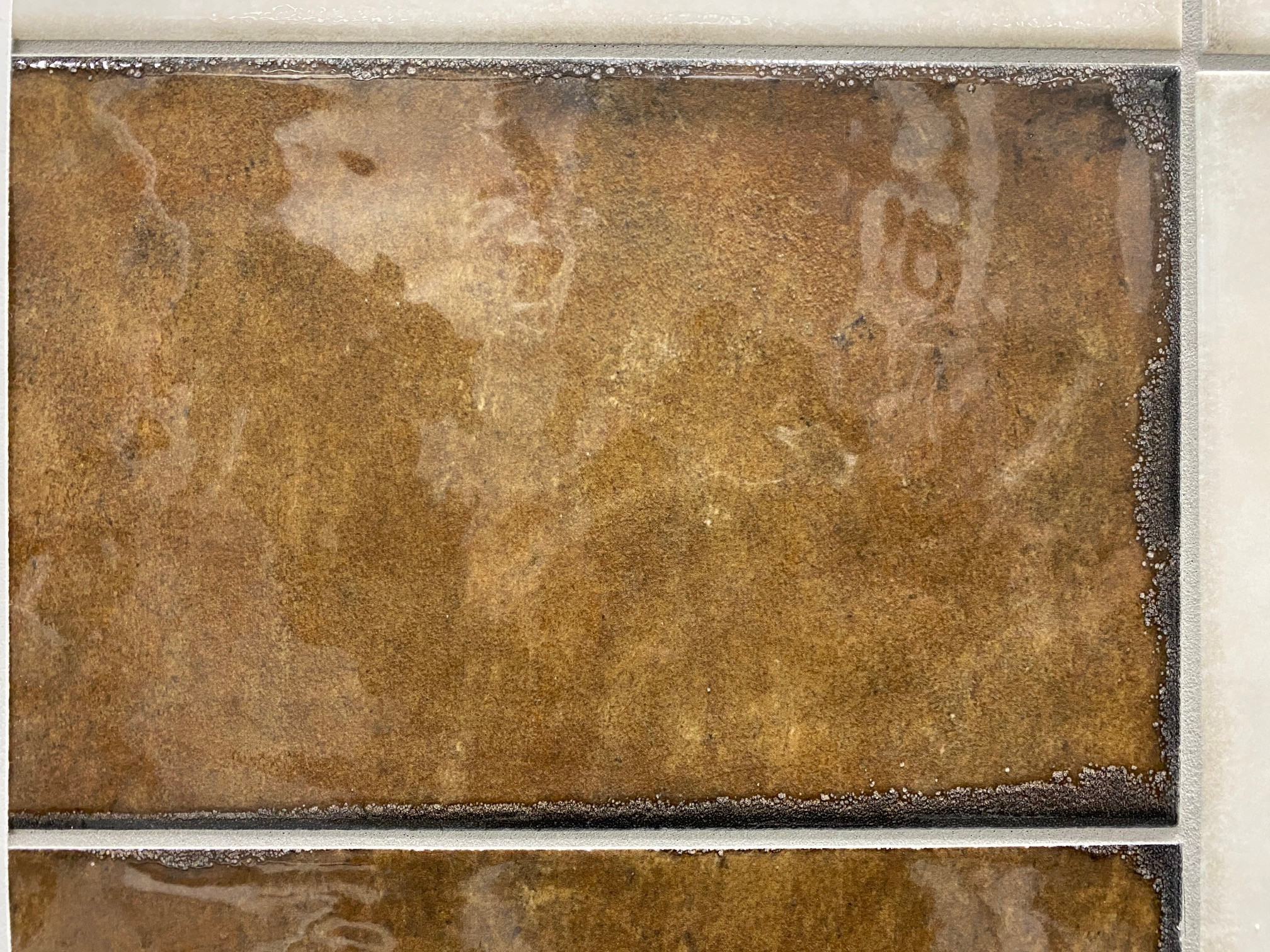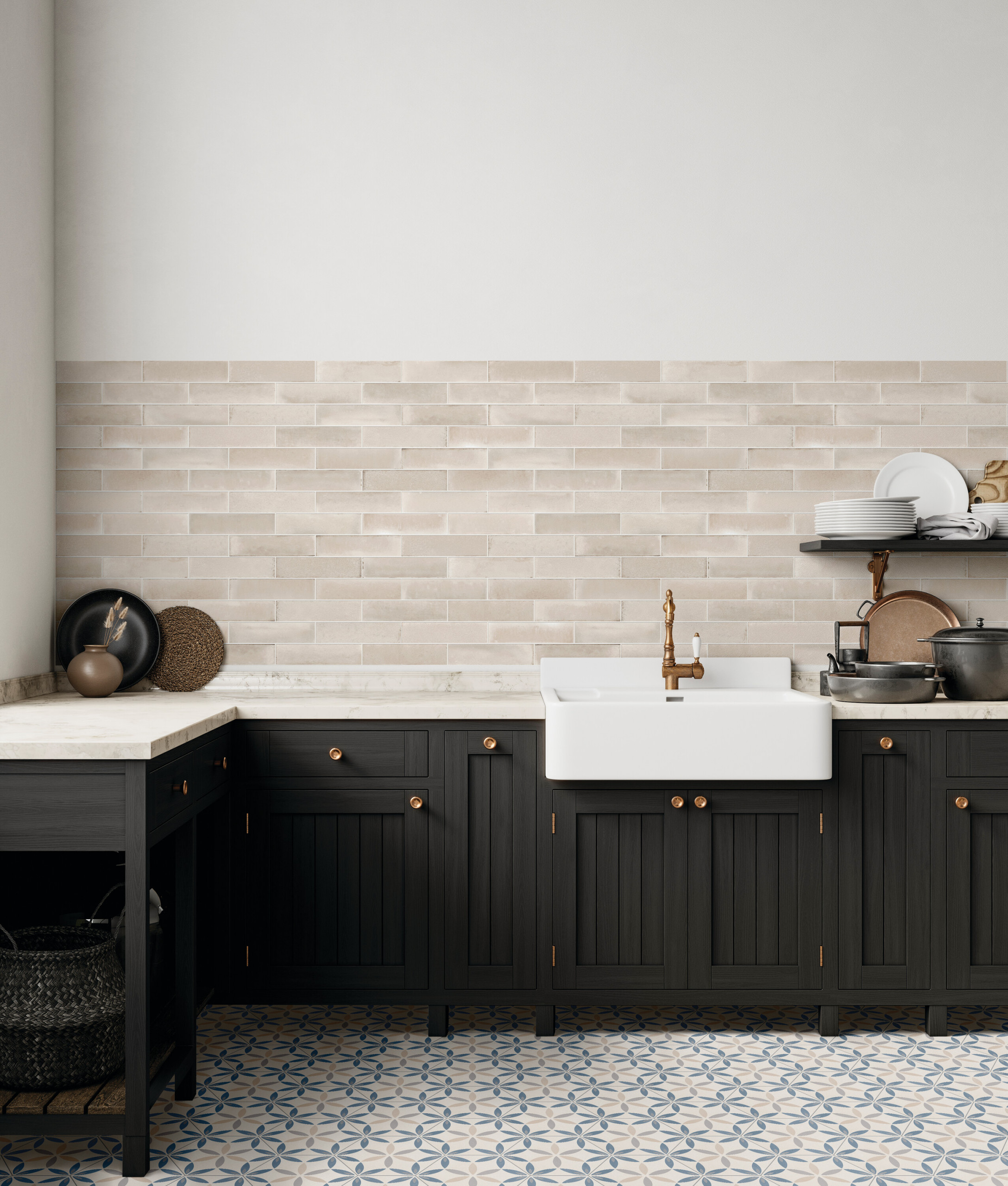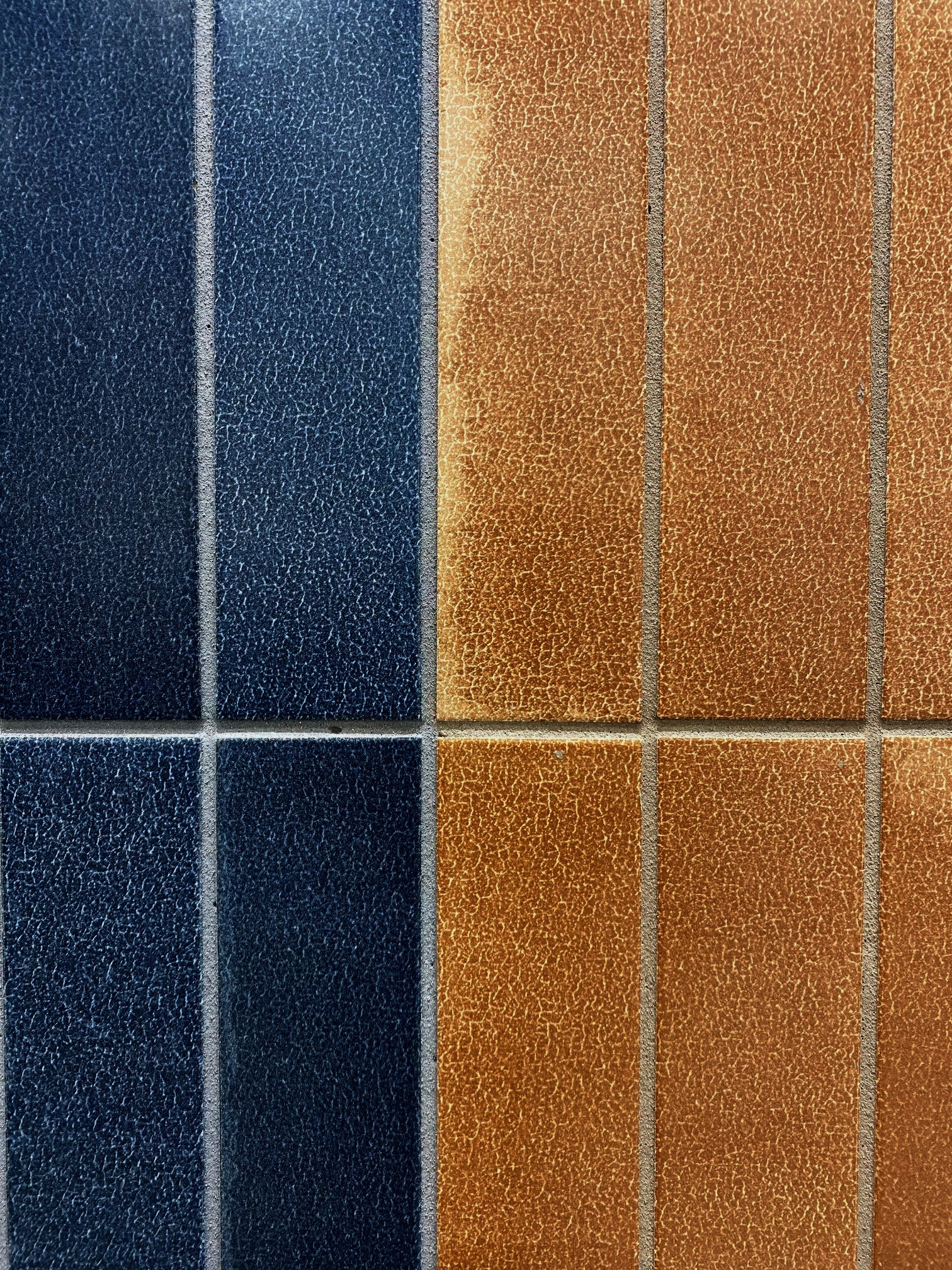 Marazzi’s new Inyo porcelain tiles have a crackled surface that gives them a rustic look. The 2-by-8-inch tiles seen here are in Indigo and Ember. Other colors are Olive, Crema and Ink, and other shapes include 8-inch hexagons, 1-by-6-inch mosaics and penny rounds.