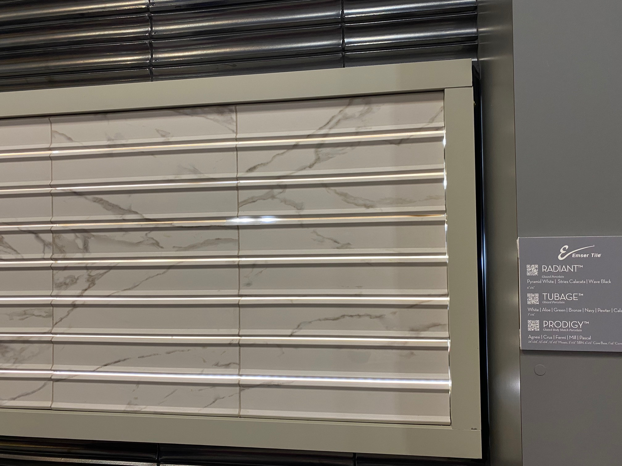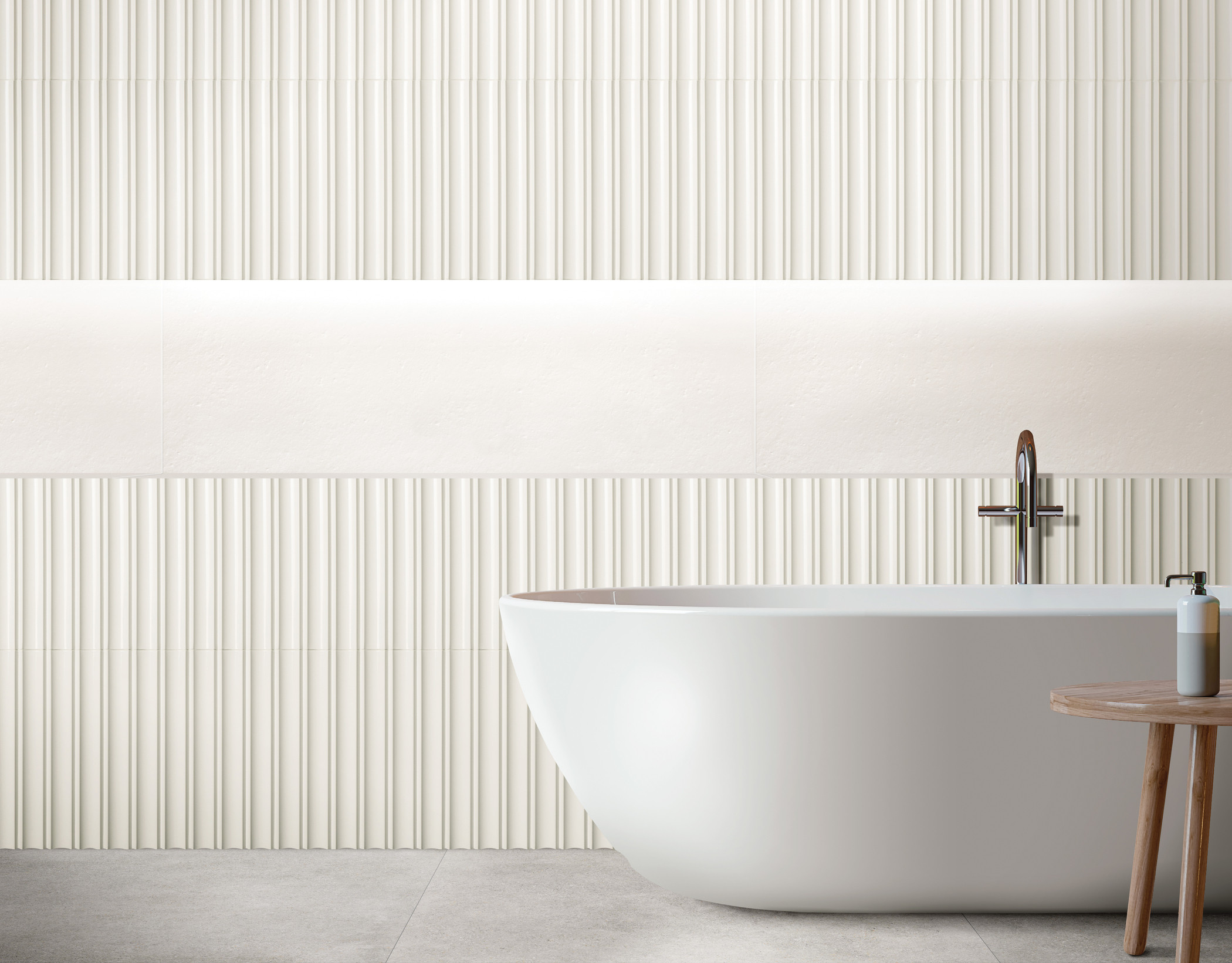 Emser’s Tubage works vertically or horizontally. The tile also can be installed on a curve or corner and comes in six shades. Shown here is Tubage in White.
