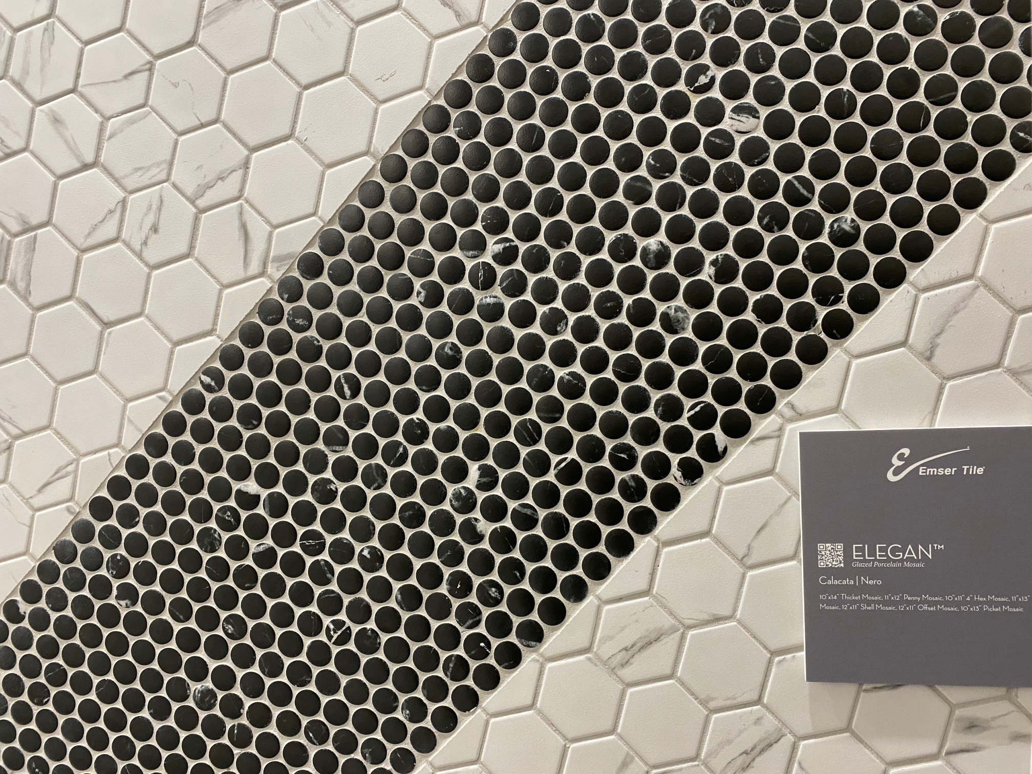Here’s Emser Tile’s take on penny rounds, from its Elegan collection of stone- and marble-look porcelain tiles, which also includes hexagons.
